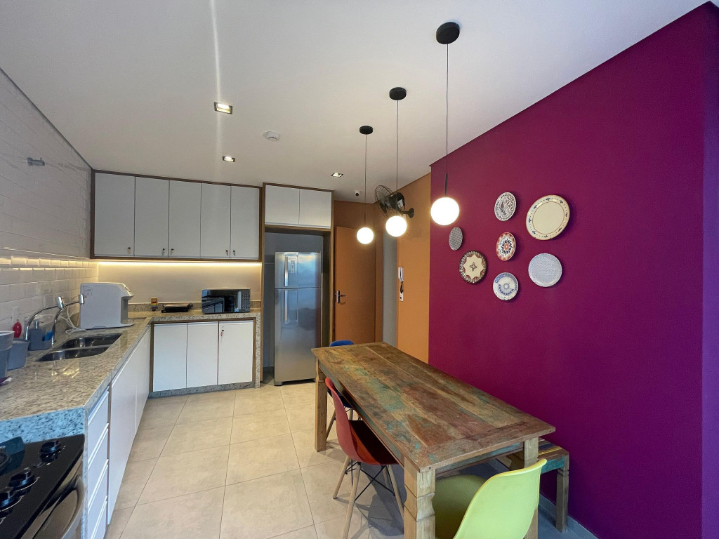 A cozinha comunitária fica no mesmo andar das suítes e é compartilhada entre as 6 unidades. Contém todos os utensílios necessários para uma estadia prática e dispõe de armários individuais com chave, onde cada suíte tem acesso ao seu.