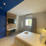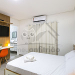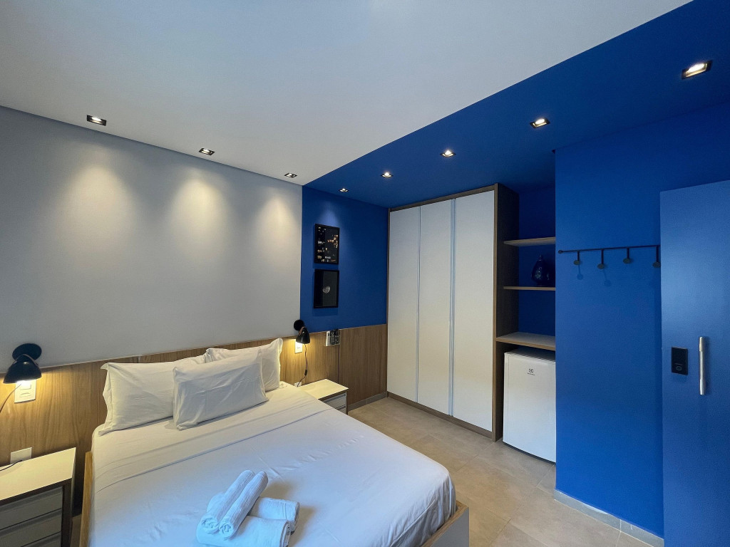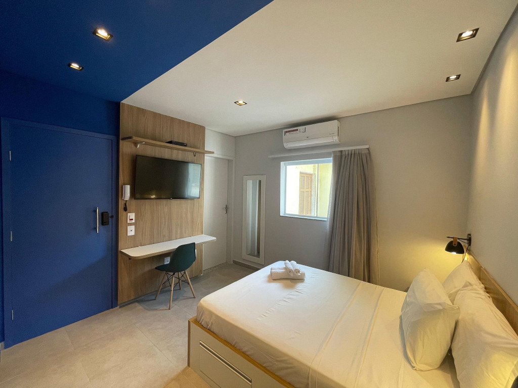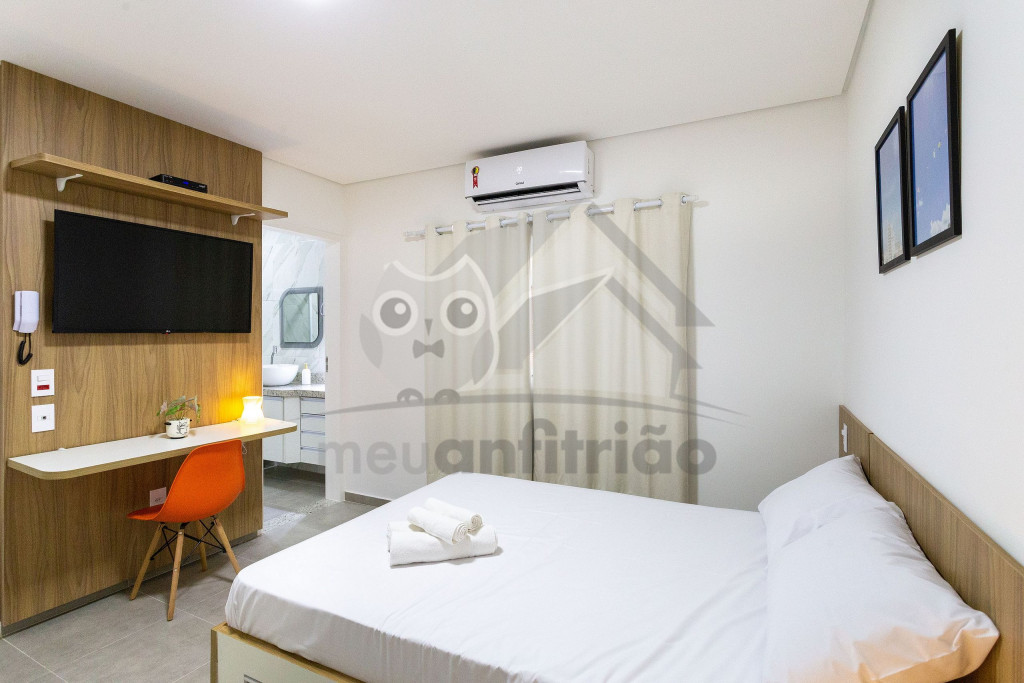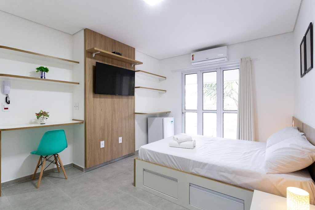 O quarto dispõe de ar-condicionado quente e frio, frigobar, armário, uma escrivaninha com cadeira para home office, além de um banheiro com chuveiro elétrico.