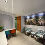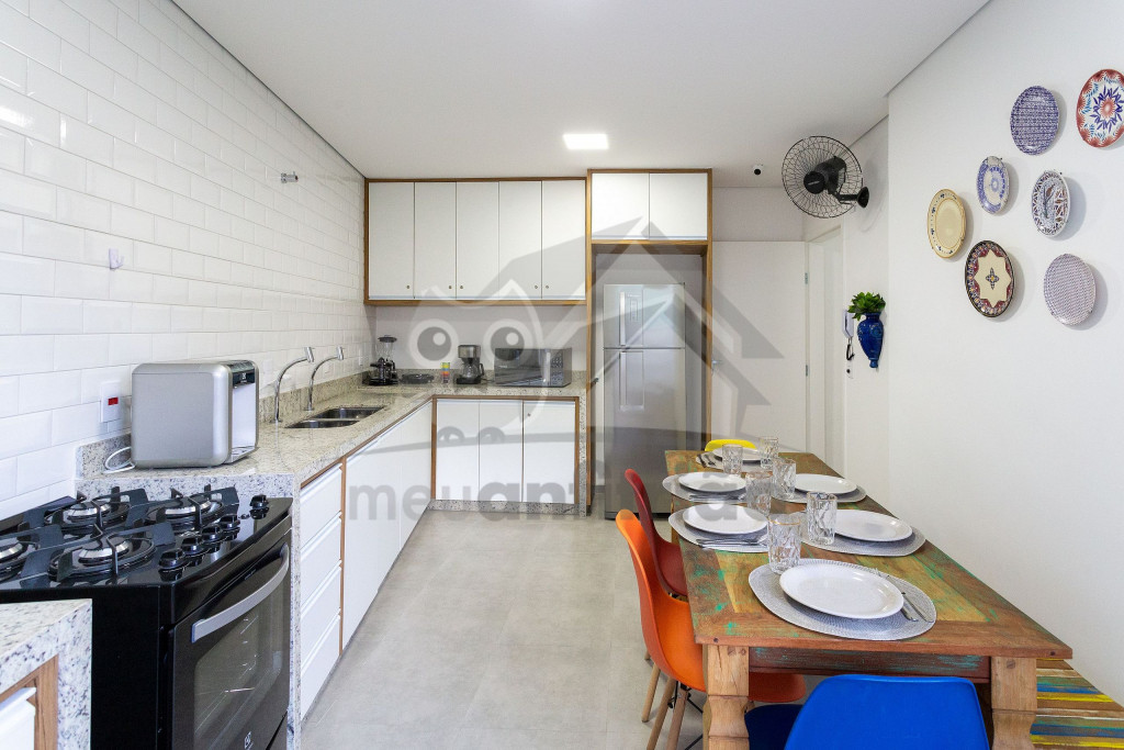 Ao lado da cozinha, temos uma lavanderia com máquina lava e seca. E, há também um lobby com mesas e cadeiras.