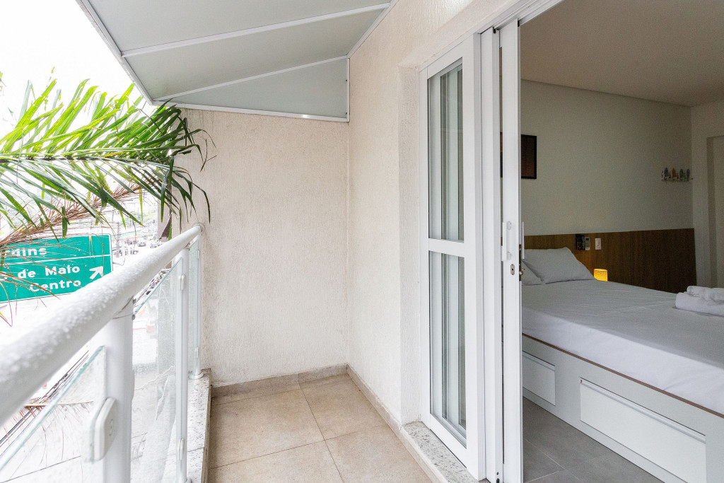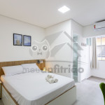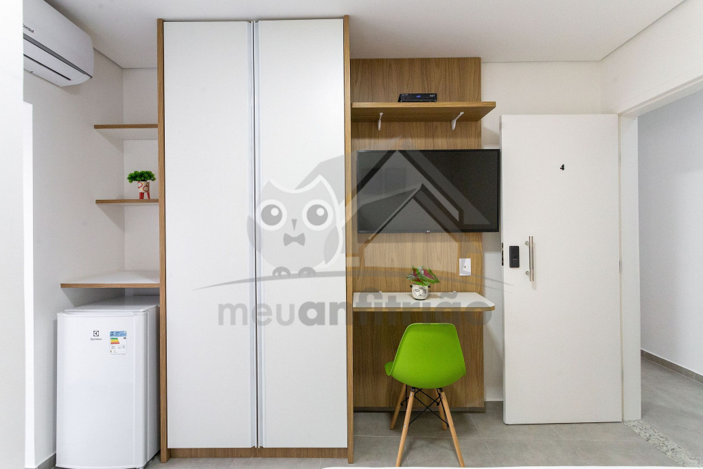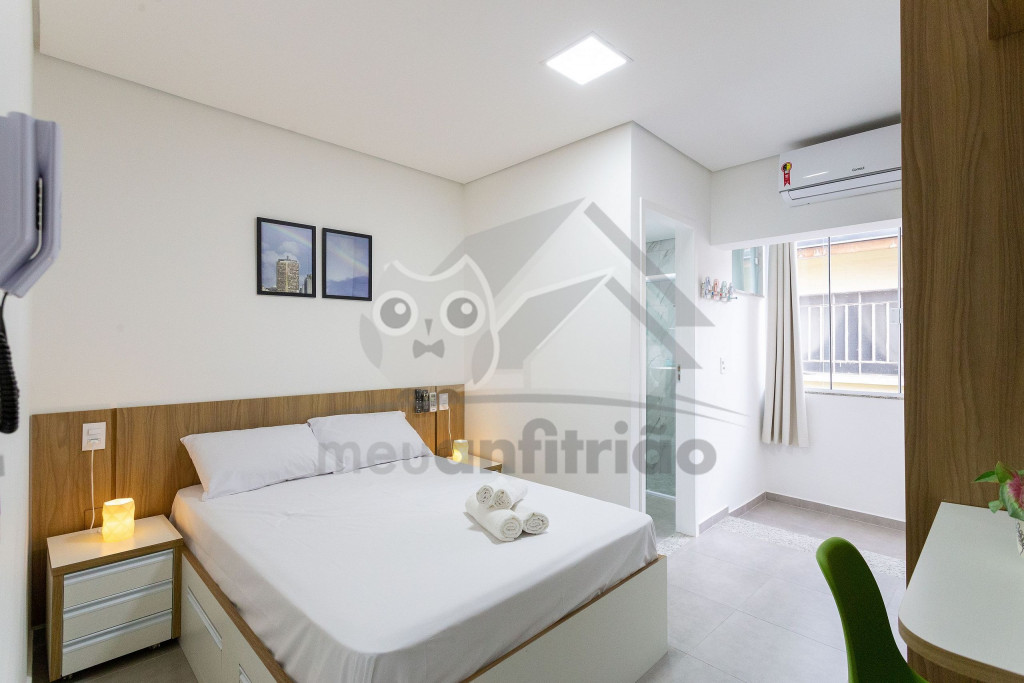 O quarto dispõe de ar-condicionado quente e frio, frigobar, armário, uma escrivaninha com cadeira para home office, além de um banheiro com chuveiro elétrico.