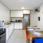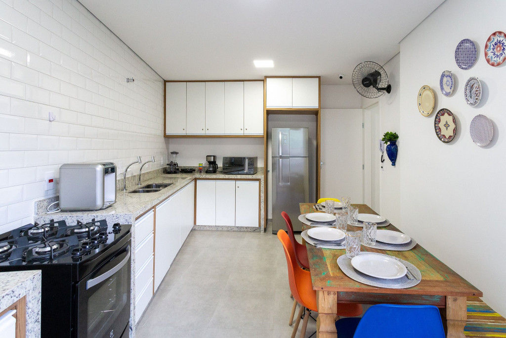 A cozinha comunitária fica no mesmo andar das suítes e é compartilhada entre as 6 unidades. Contém todos os utensílios necessários para uma estadia prática e dispõe de armários individuais com chave, onde cada suíte tem acesso ao seu.