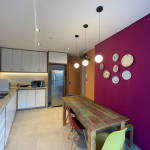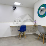 Ao lado da cozinha, temos uma lavanderia com máquina lava e seca. E, há também um lobby com mesas e cadeiras.