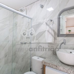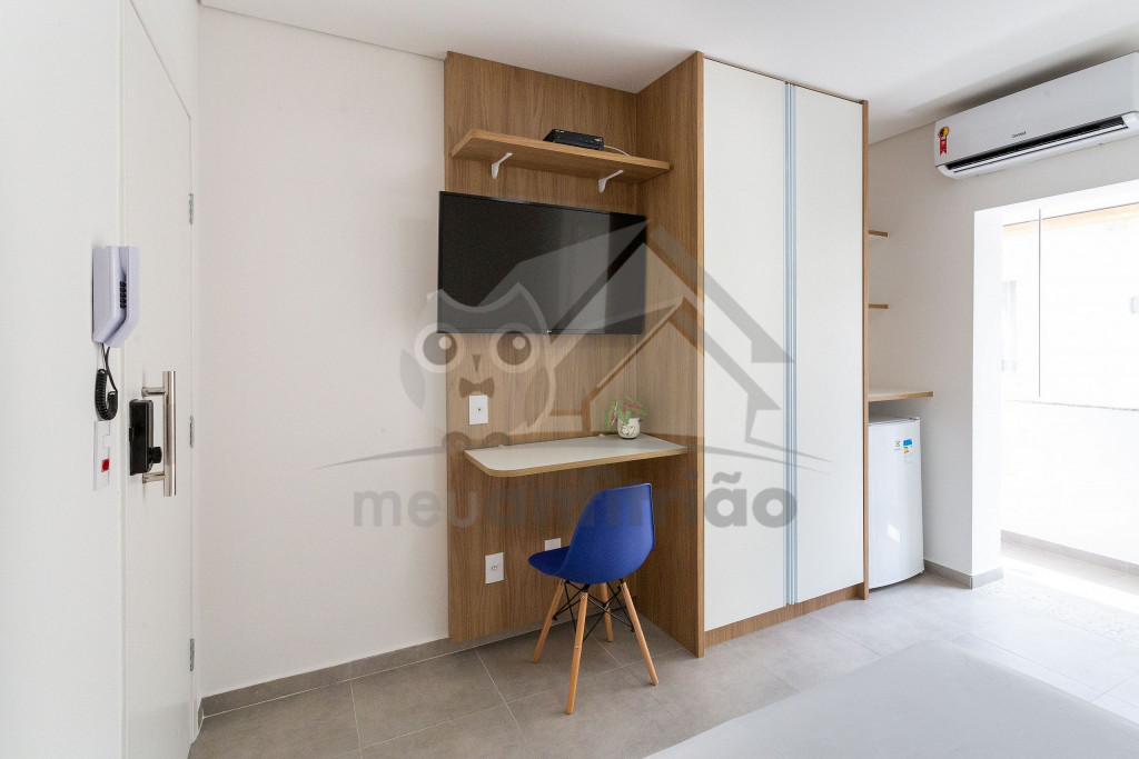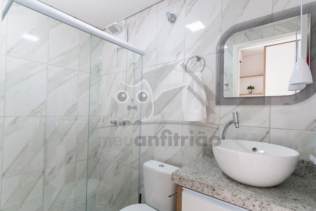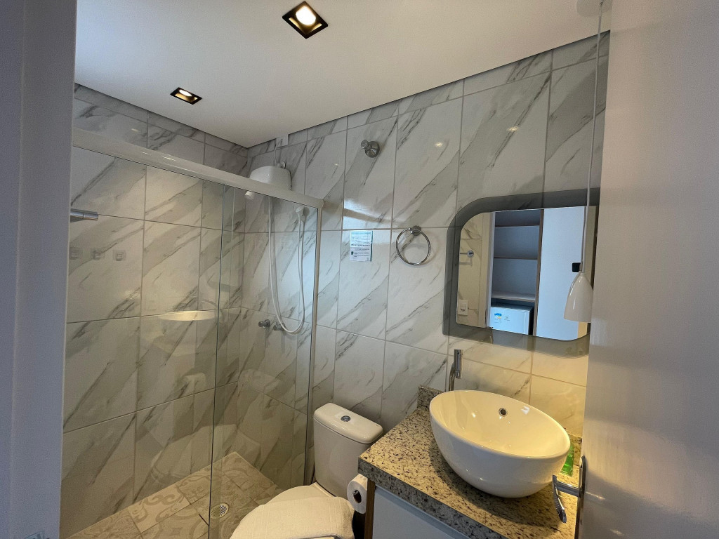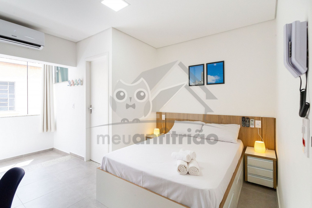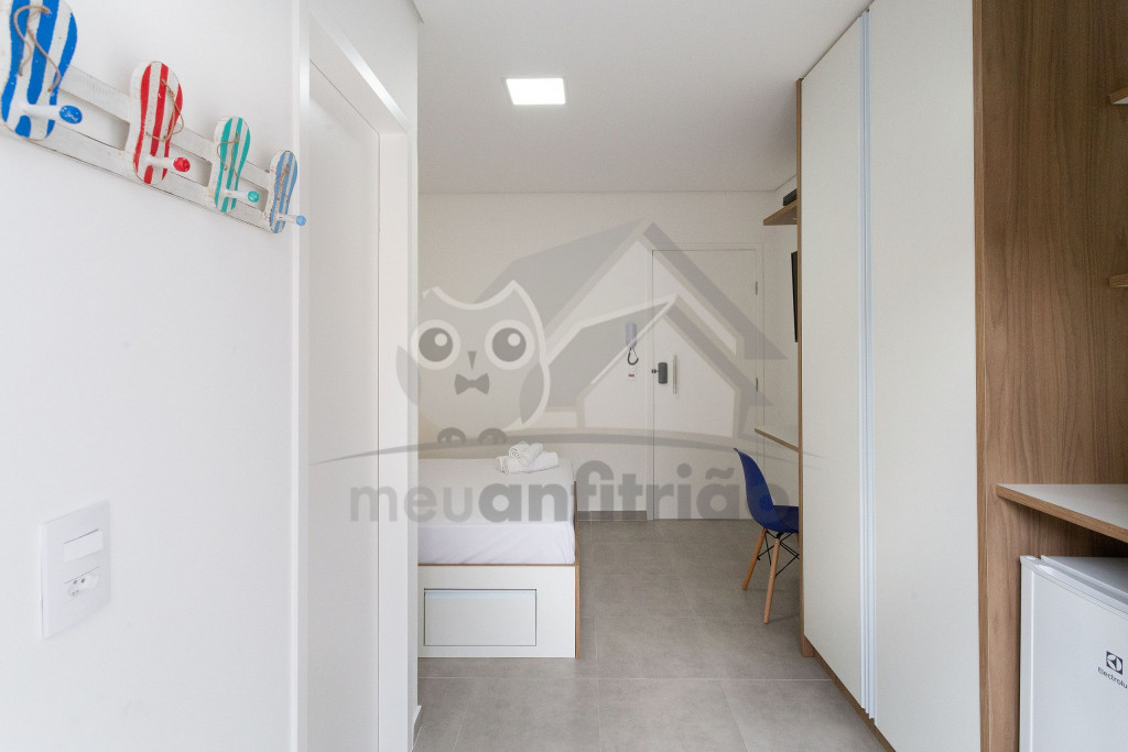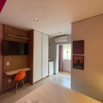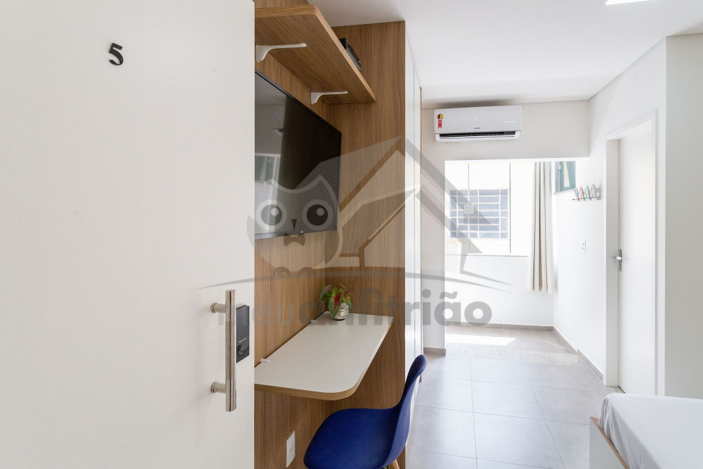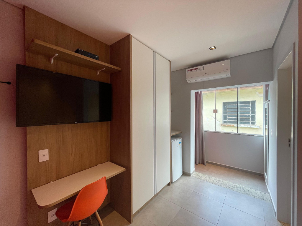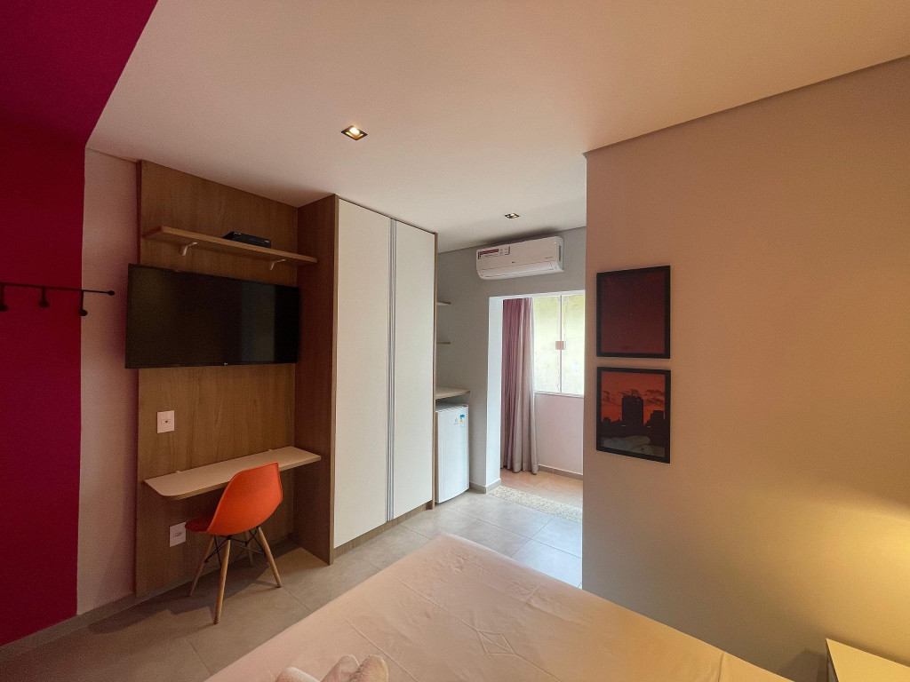 O quarto dispõe de ar-condicionado quente e frio, frigobar, armário, uma escrivaninha com cadeira para home office, além de um banheiro com chuveiro elétrico.