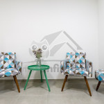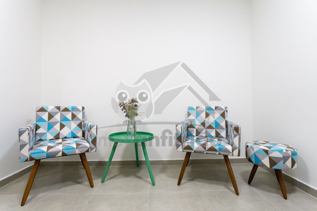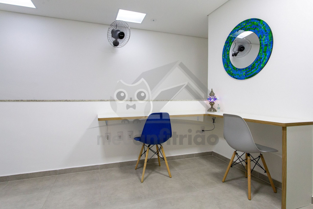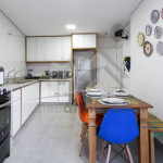 Ao lado da cozinha, temos uma lavanderia com máquina lava e seca. E, há também um lobby com mesas e cadeiras.