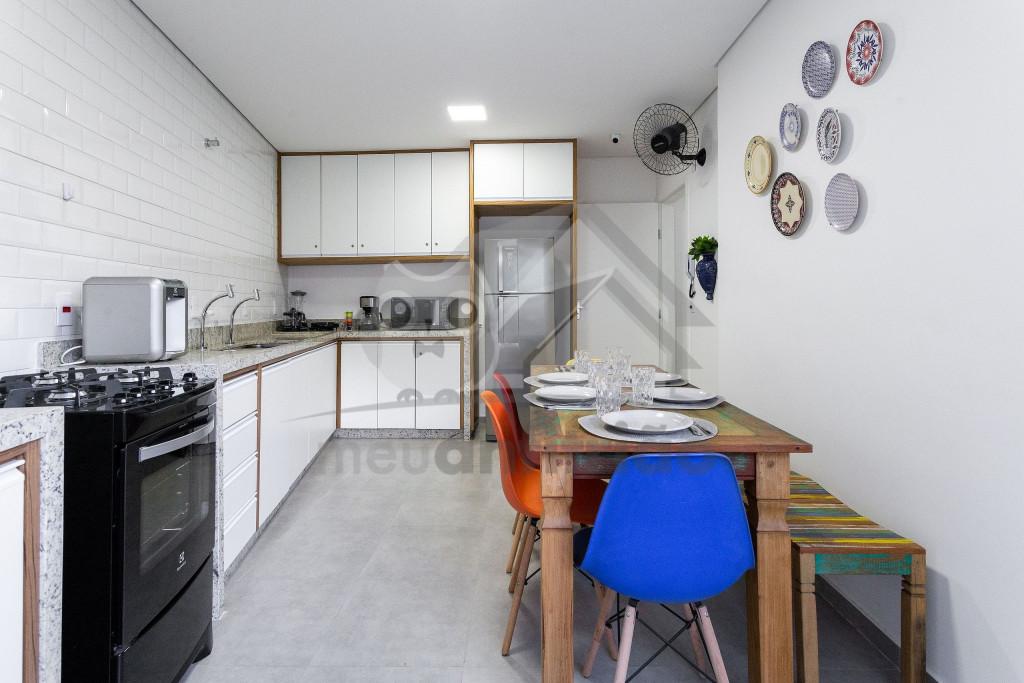 A cozinha comunitária fica no mesmo andar das suítes e é compartilhada entre as 6 unidades. Contém todos os utensílios necessários para uma estadia prática e dispõe de armários individuais com chave, onde cada suíte tem acesso ao seu.