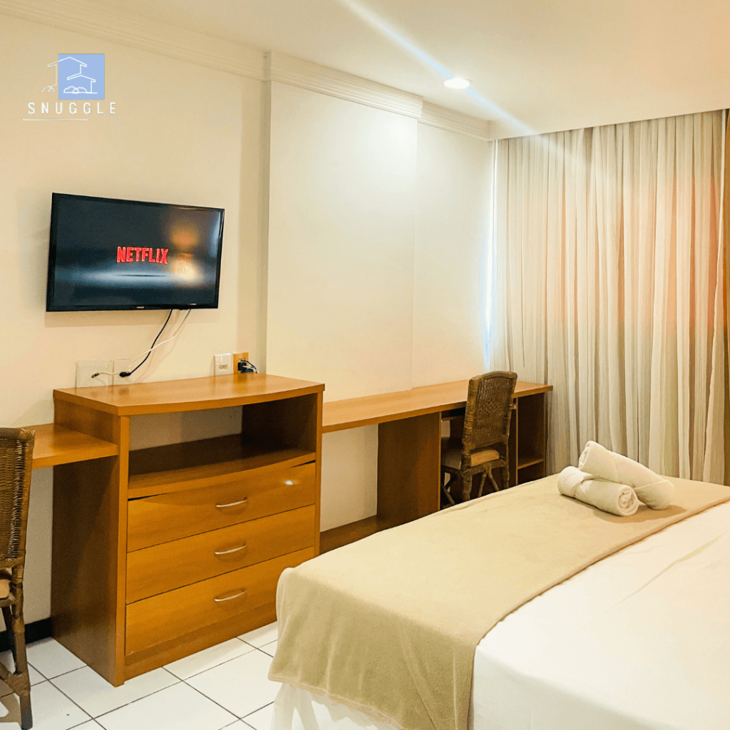 Conte com uma suíte confortável, com ar-condicionado e utensílios, além de um condomínio com piscina, restaurante e agencia de turismo. Venha se hospedar conosco e desfrutar do melhor da sua viagem com toda comodidade que você precisa.