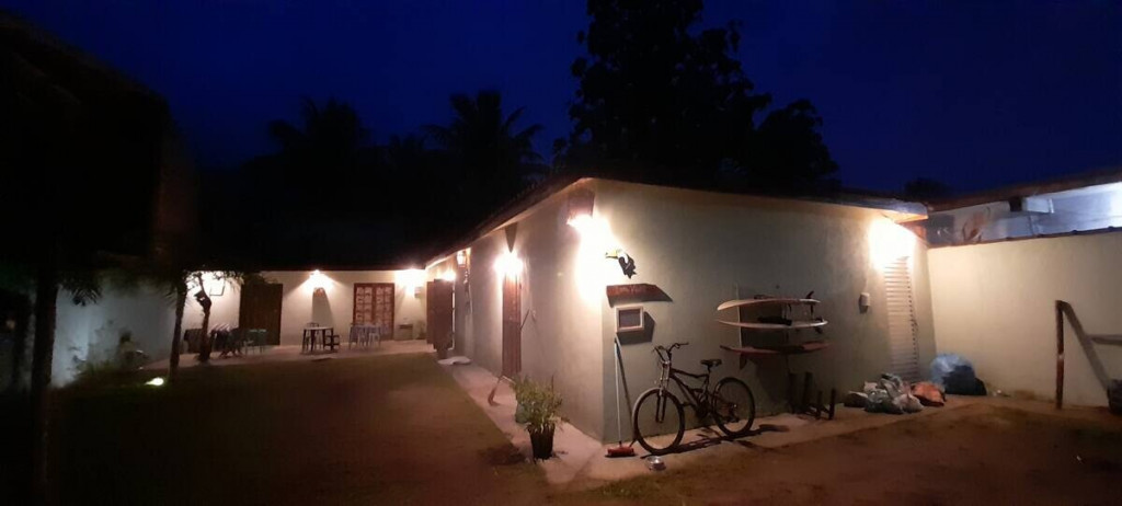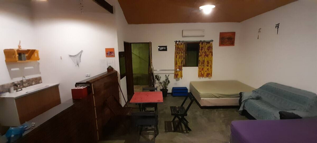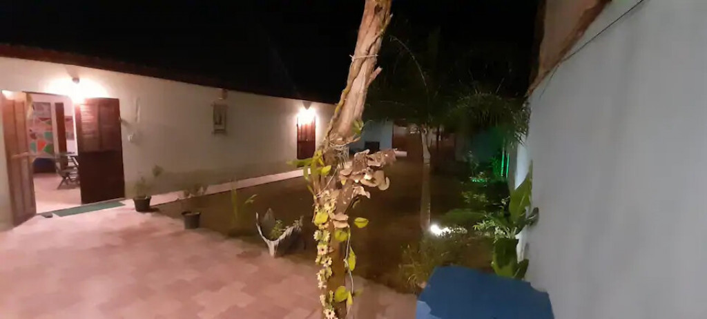 espaço gramado, com estacionamento e churrasqueira móvel, ducha externa