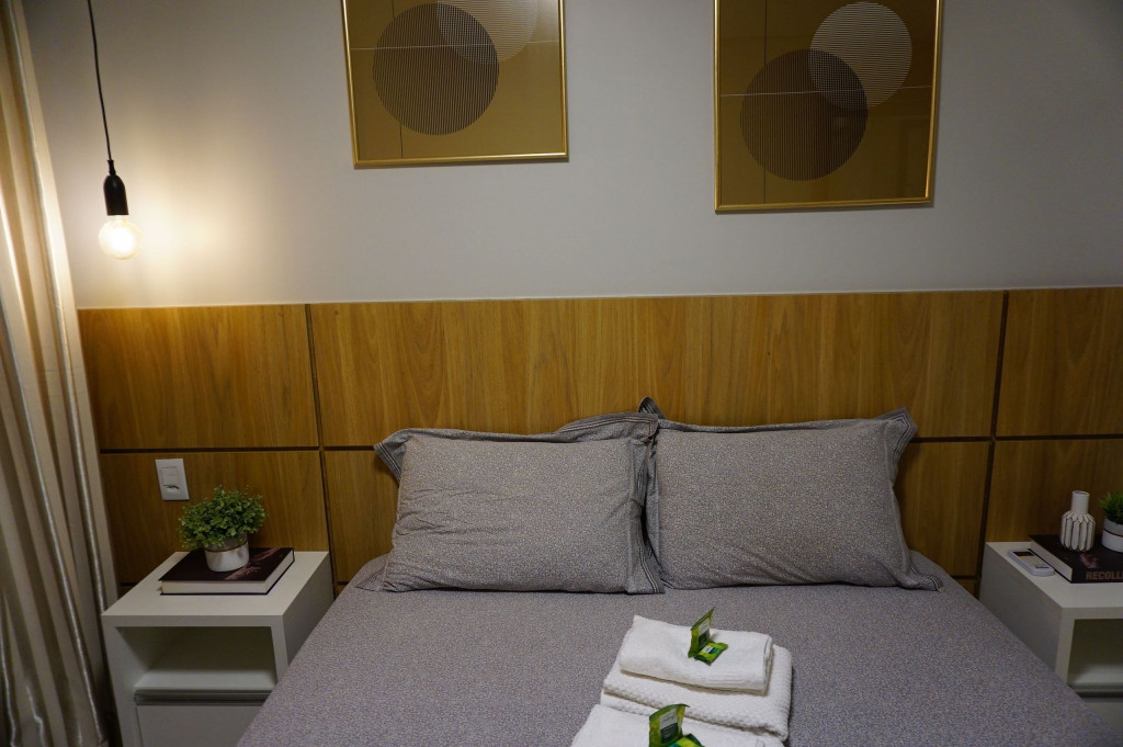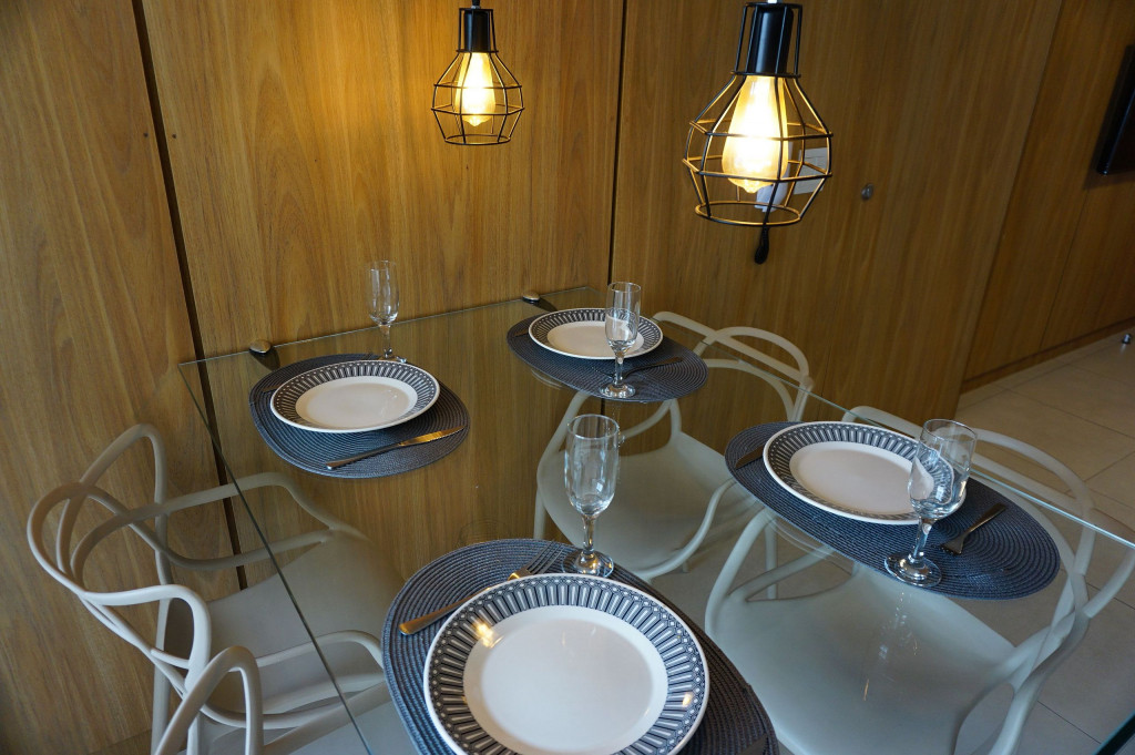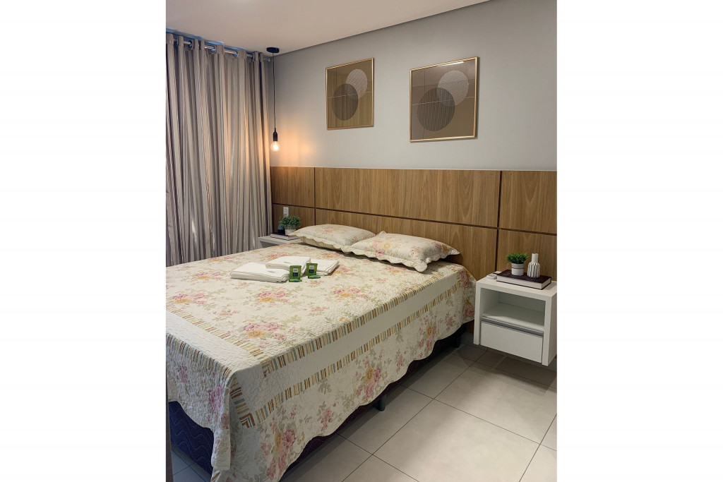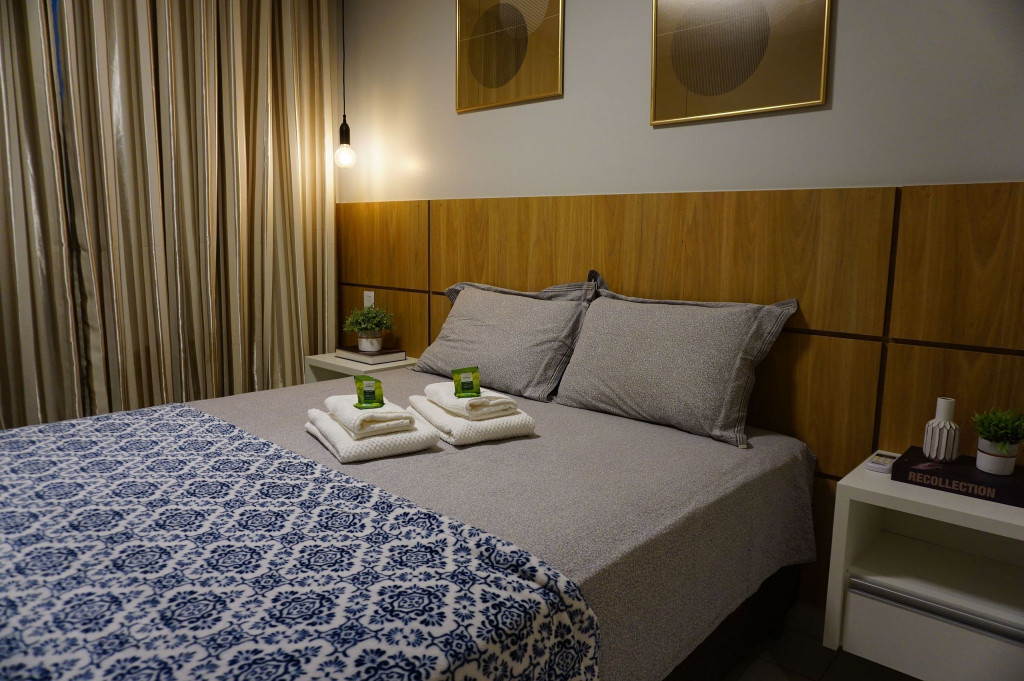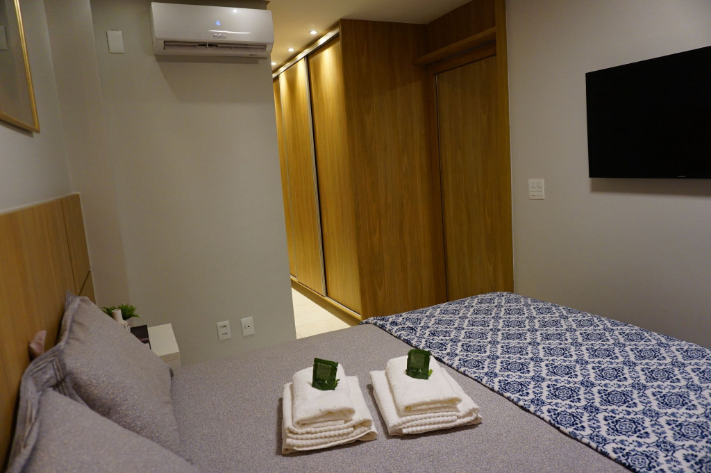 Totalmente exclusivo ao hóspede, o apto conta com uma sala com TV, ar condicionado e um confortável sofá. Cozinha repleta em armários, com mesa de jantar romântica e diversos utensílios como: pratos, taças para champanhe e vinho, panelas, talheres, kit de churrasco, garrafa para café e sanduicheira. Quarto com cama de casal, Smart TV, ar condicionado, roupa de cama e travesseiros. Banheiro com sabonete e papel higiênico, closet com armário e uma excelente sacada gourmet com churrasqueira a carvão, com acesso pelo quarto e pela cozinha. Áreas em comum do condomínio estão sujeitas a agendamento na portaria (Lavanderia, Piscina, Jacuzzi e Academia).