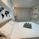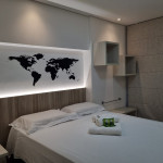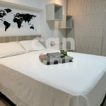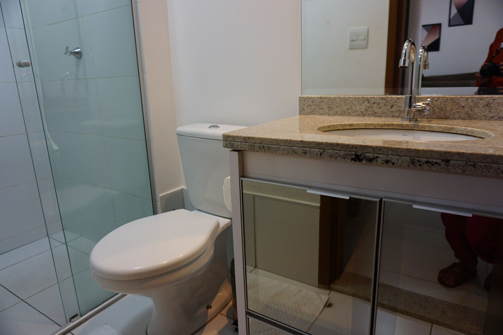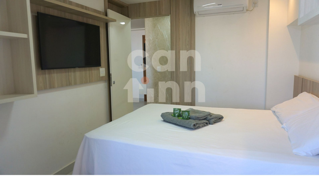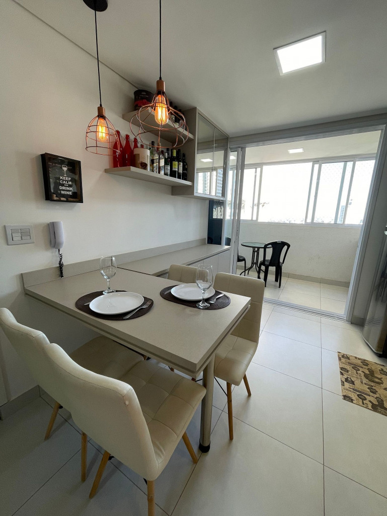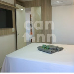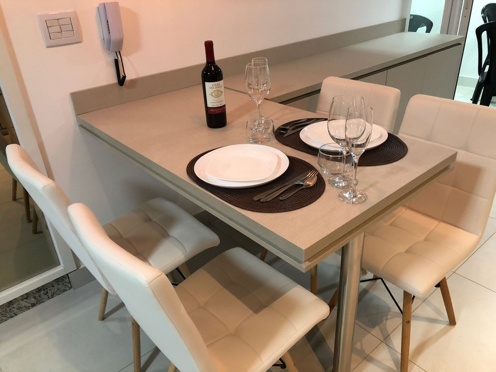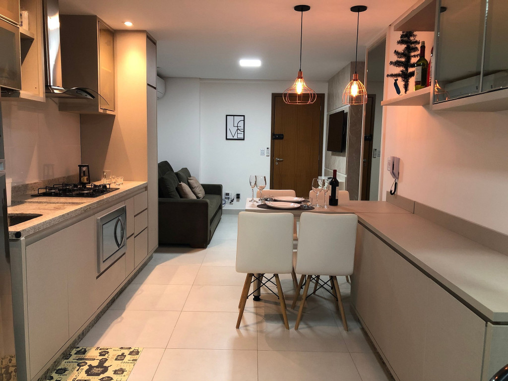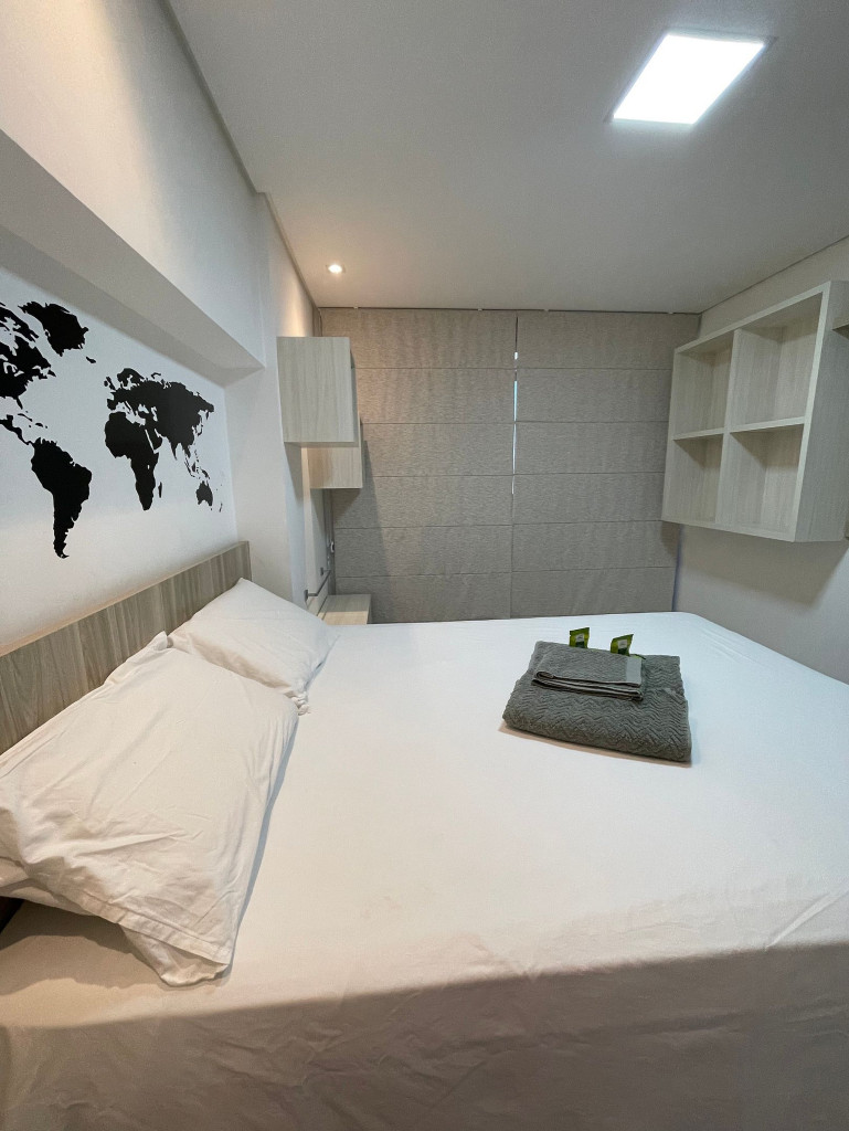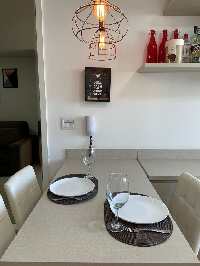 Totalmente exclusivo ao hóspede, o apto conta com uma sala com TV, ar condicionado e um confortável sofá. Cozinha repleta em armários, com mesa de jantar romântica e diversos utensílios como: pratos, taças para champanhe e vinho, panelas, talheres, kit de churrasco, garrafa para café e sanduicheira. Quarto com cama de casal, Smart TV, ar condicionado, roupa de cama e travesseiros. Banheiro com sabonete e papel higiênico, closet com armário e uma excelente sacada gourmet com churrasqueira a carvão, com acesso pelo quarto e pela cozinha. Áreas em comum do condomínio estão sujeitas a agendamento na portaria (Lavanderia, Piscina, Jacuzzi e Academia).