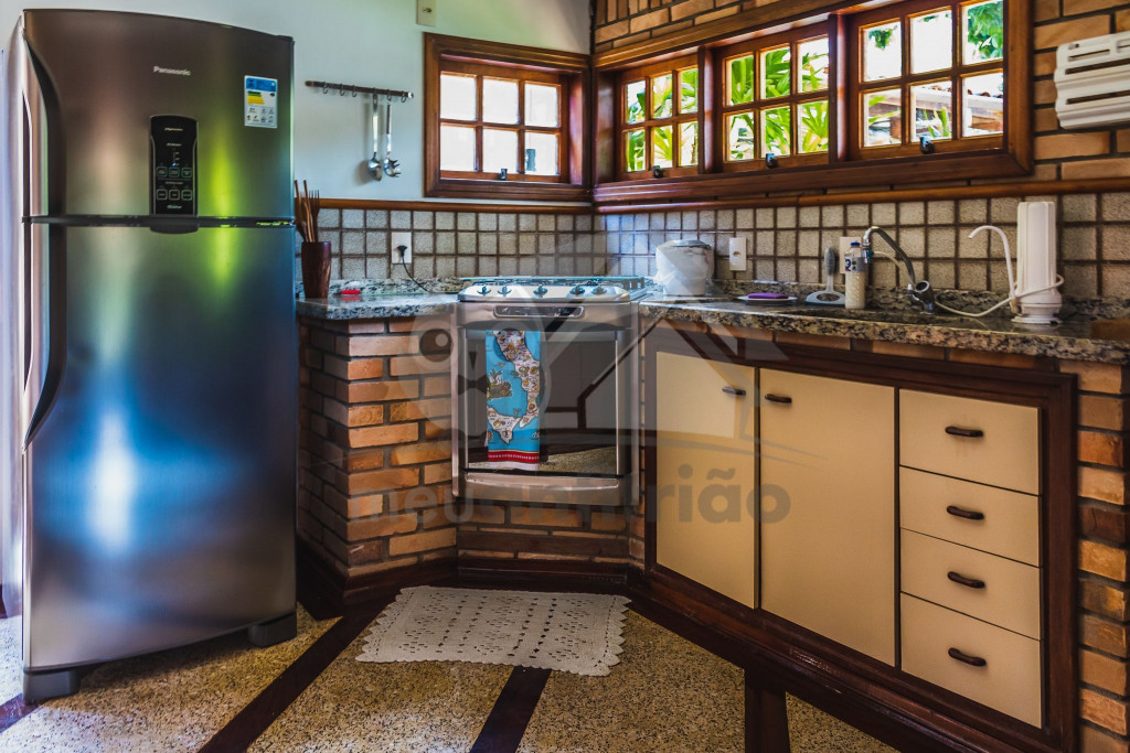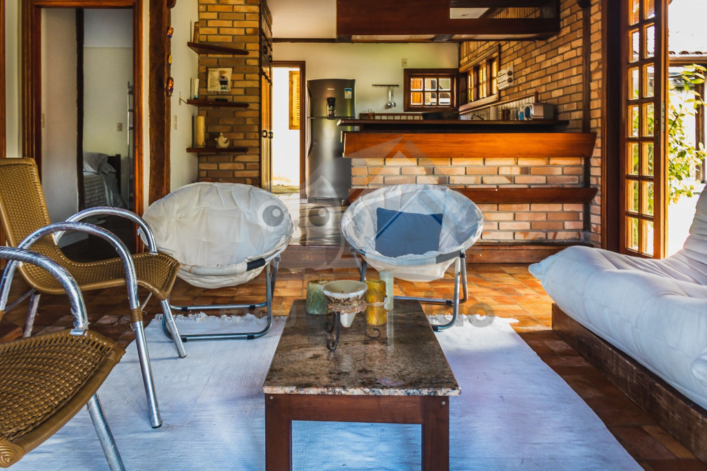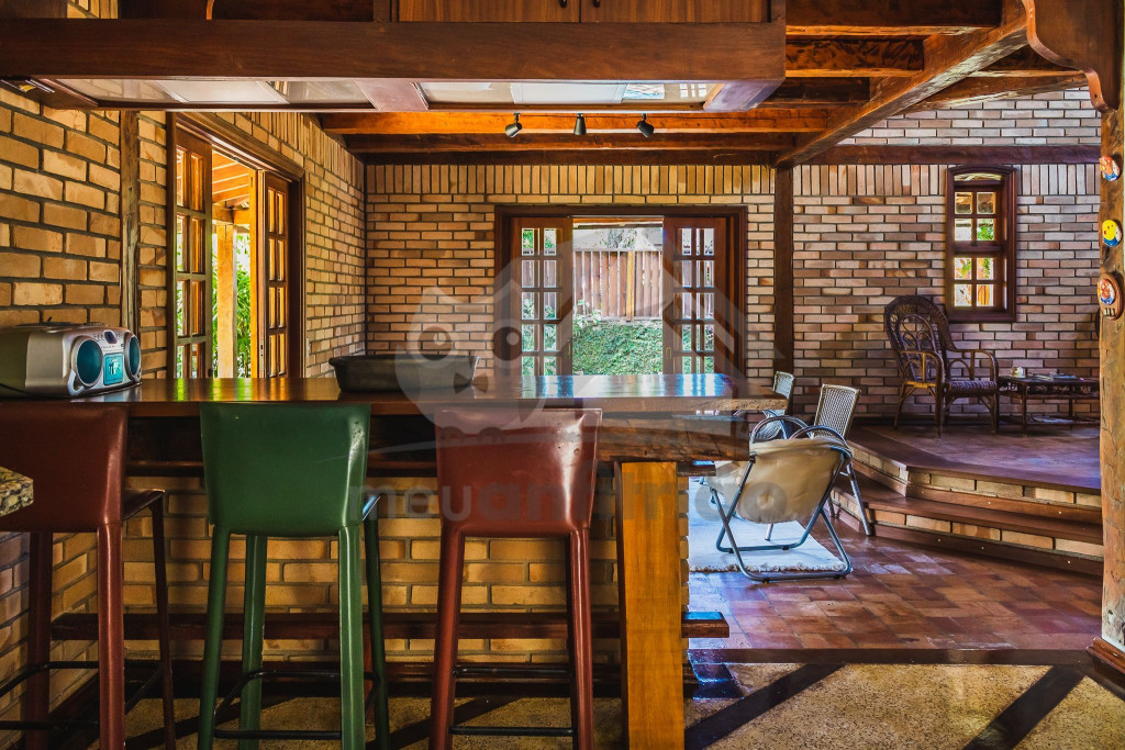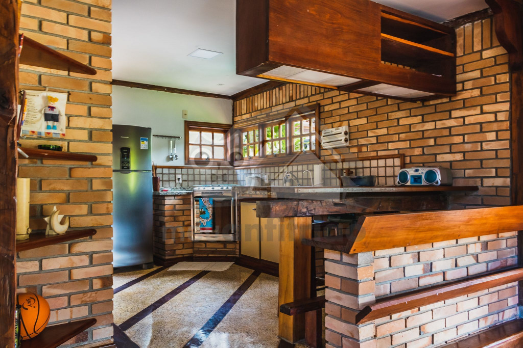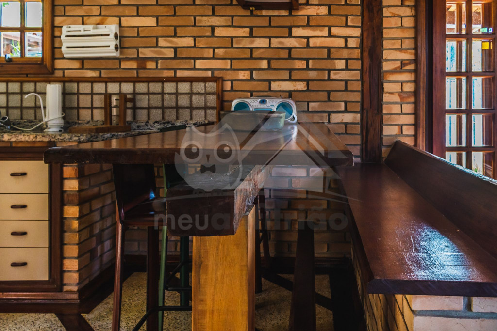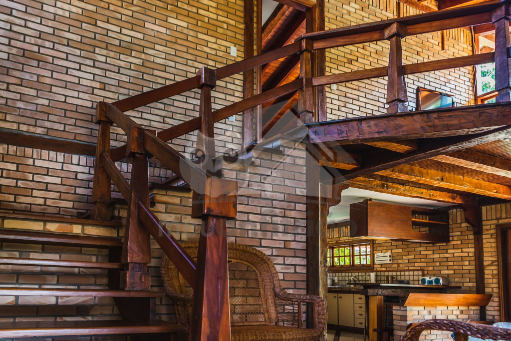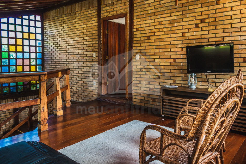 A casa é de tijolos e com acabamento em madeira, trazendo um ar aconchegante. No piso térreo temos uma sala de estar e uma cozinha integrada com todos os utensílios necessários para estadia.