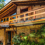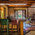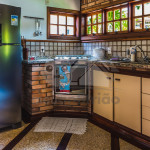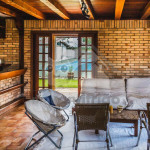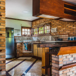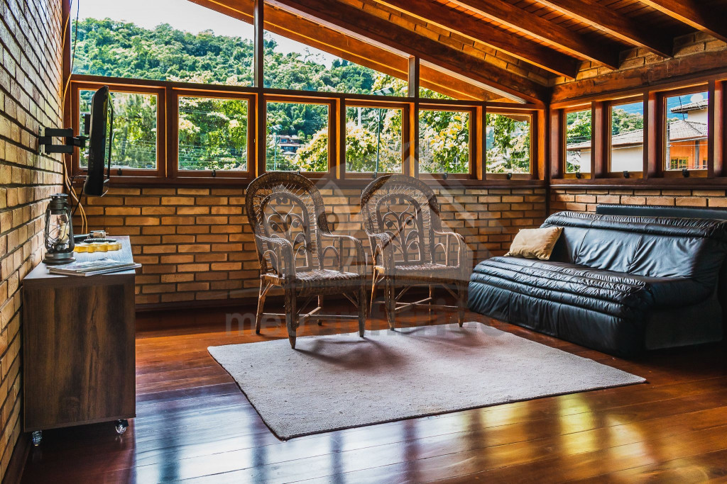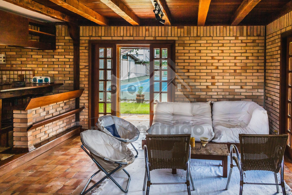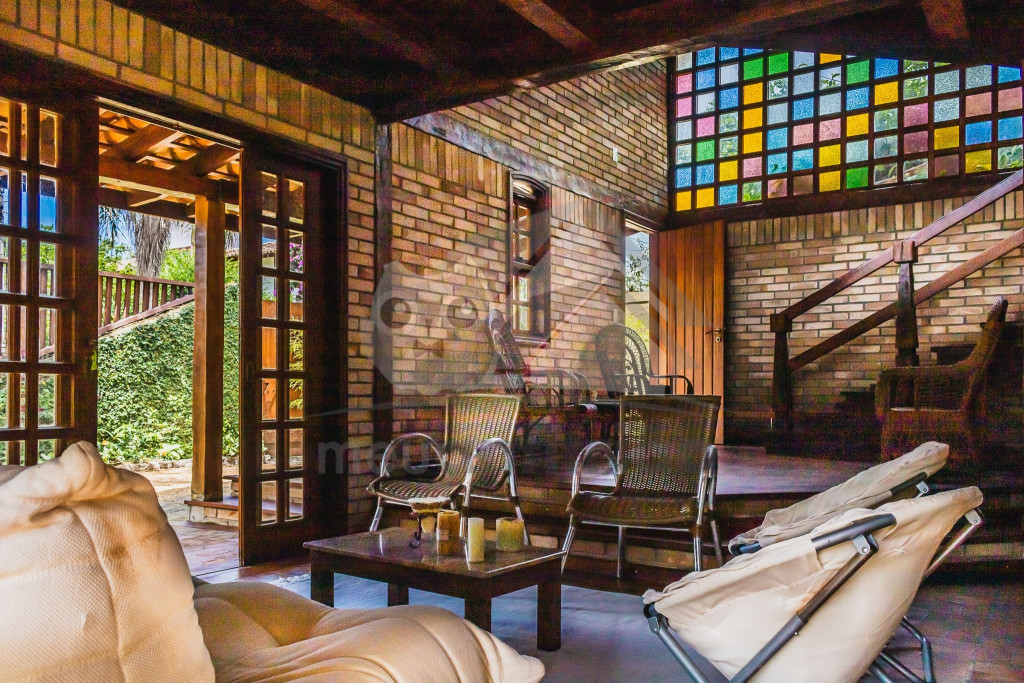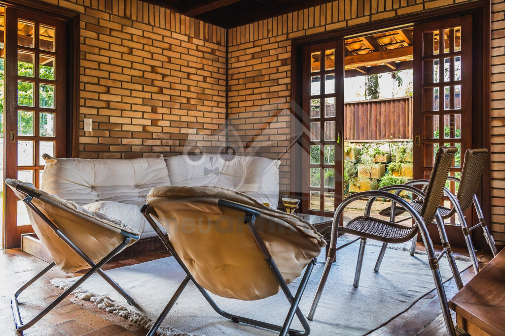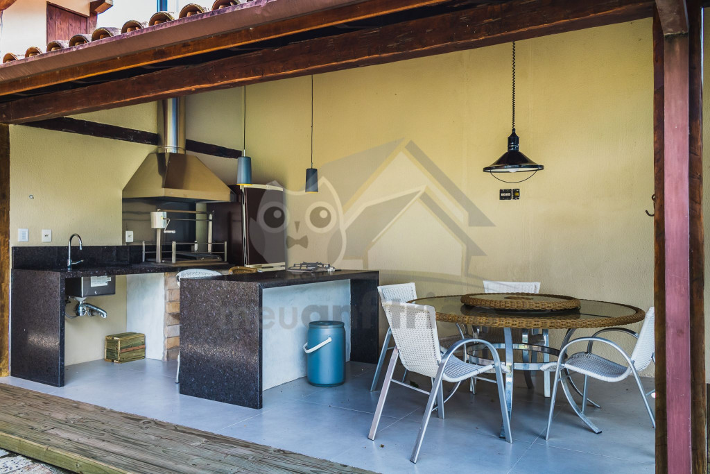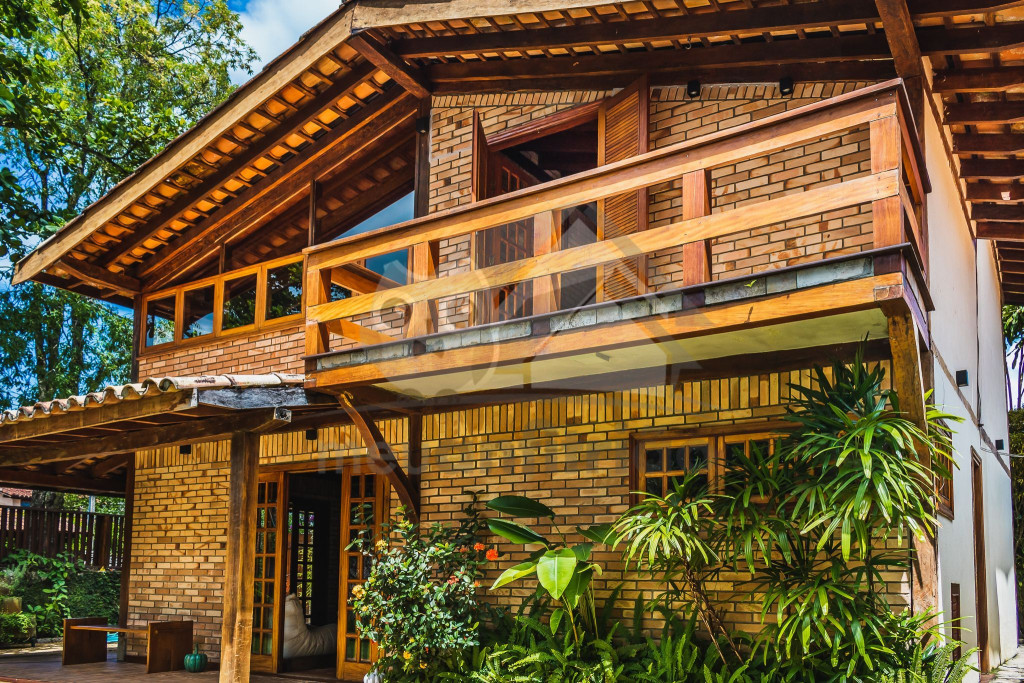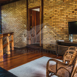 A casa é de tijolos e com acabamento em madeira, trazendo um ar aconchegante. No piso térreo temos uma sala de estar e uma cozinha integrada com todos os utensílios necessários para estadia.