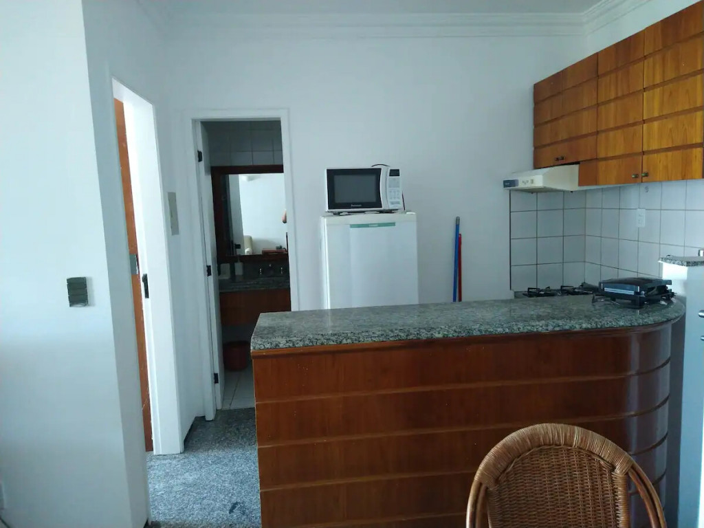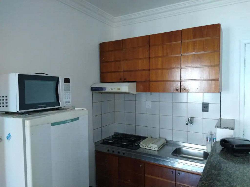 É um apartamento confortável e aconchegante com sala de estar/jantar com sofá cama, tv LCD com sinal de canais á cabo, ar condicionado no quarto, cozinha americana com fogão cook top, geladeira, pia e utensílios domésticos básicos para fazer refeições para duas pessoas, e uma pequena varanda. O quarto tem uma cama tamanho Queen , guarda roupa com gavetas e cabides e um WC social.
