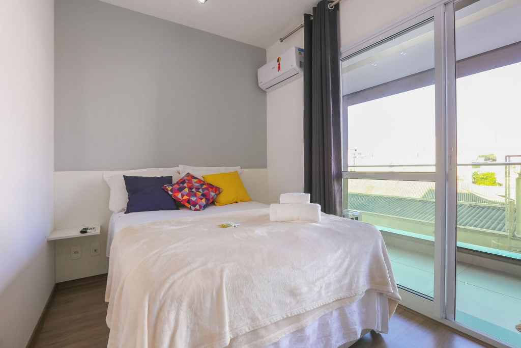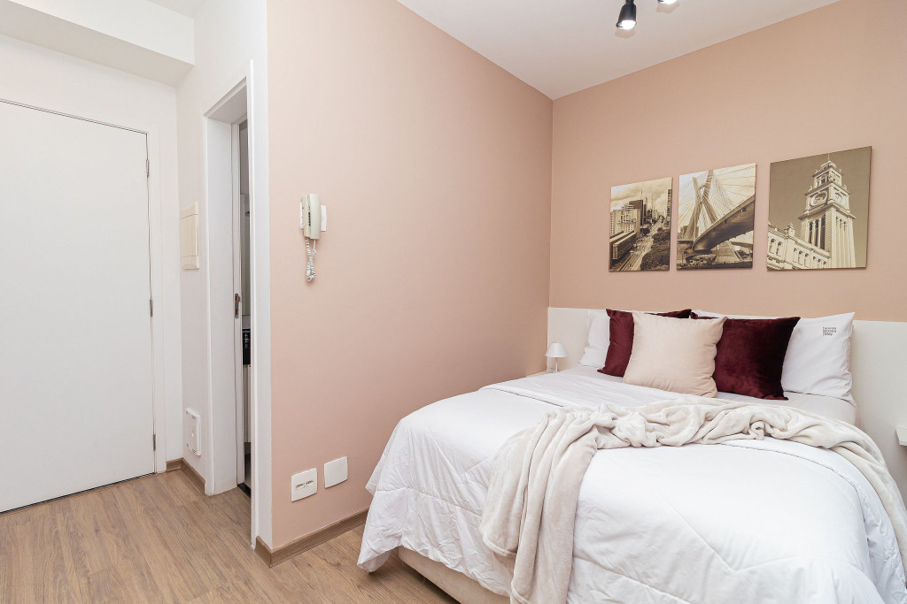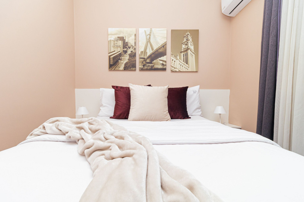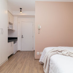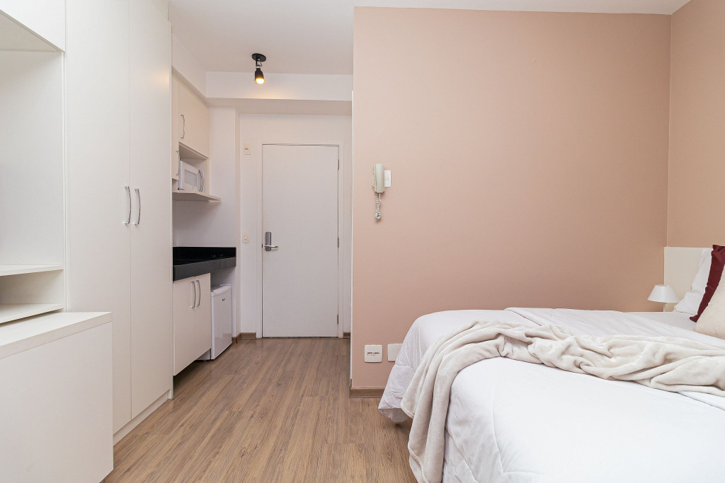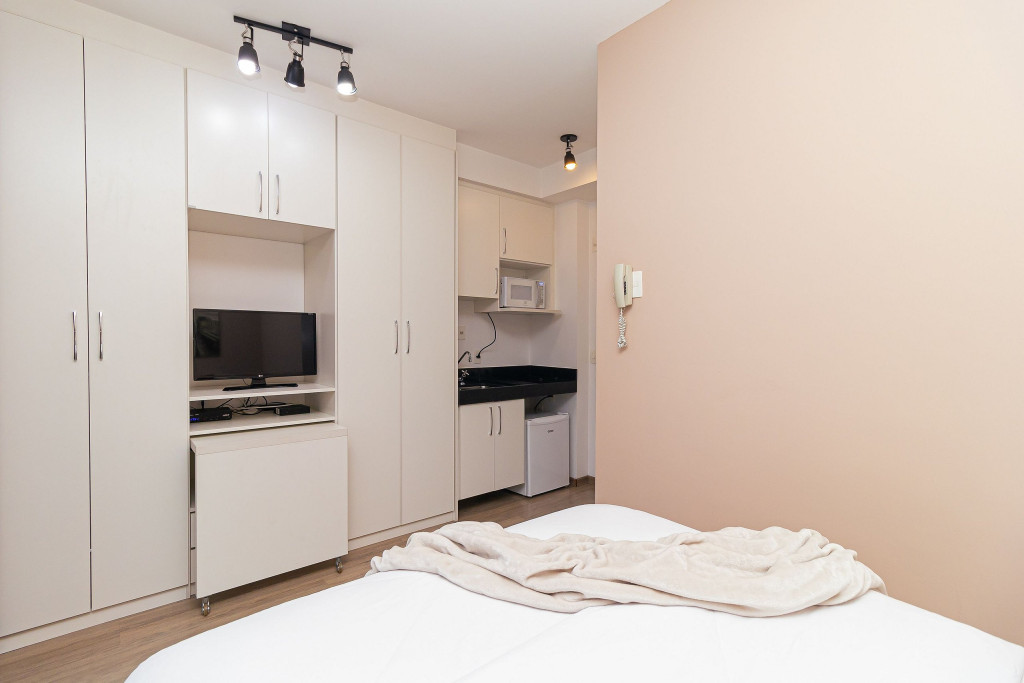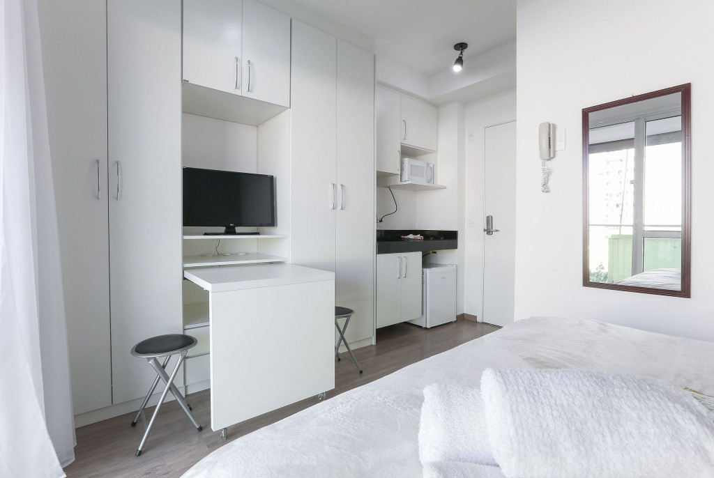 Acomodação completa para sua estadia, o espaço é moderno, bem aproveitado e decorado nas cores cinza e branco para você se hospedar com conforto e elegância na rua Turiassú ao lado do Allianz Parque, com frigobar, fogão por indução, microondas, utensílios de cozinha, ar-condicionado, cama queen-size, wi-fi e televisão.