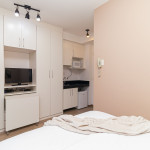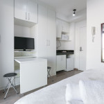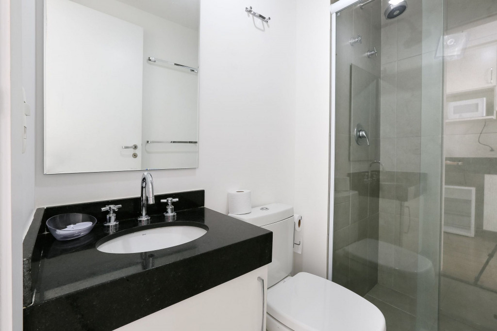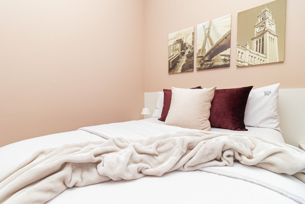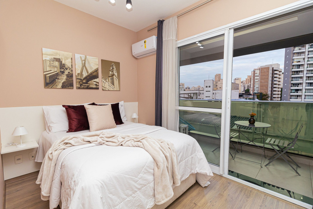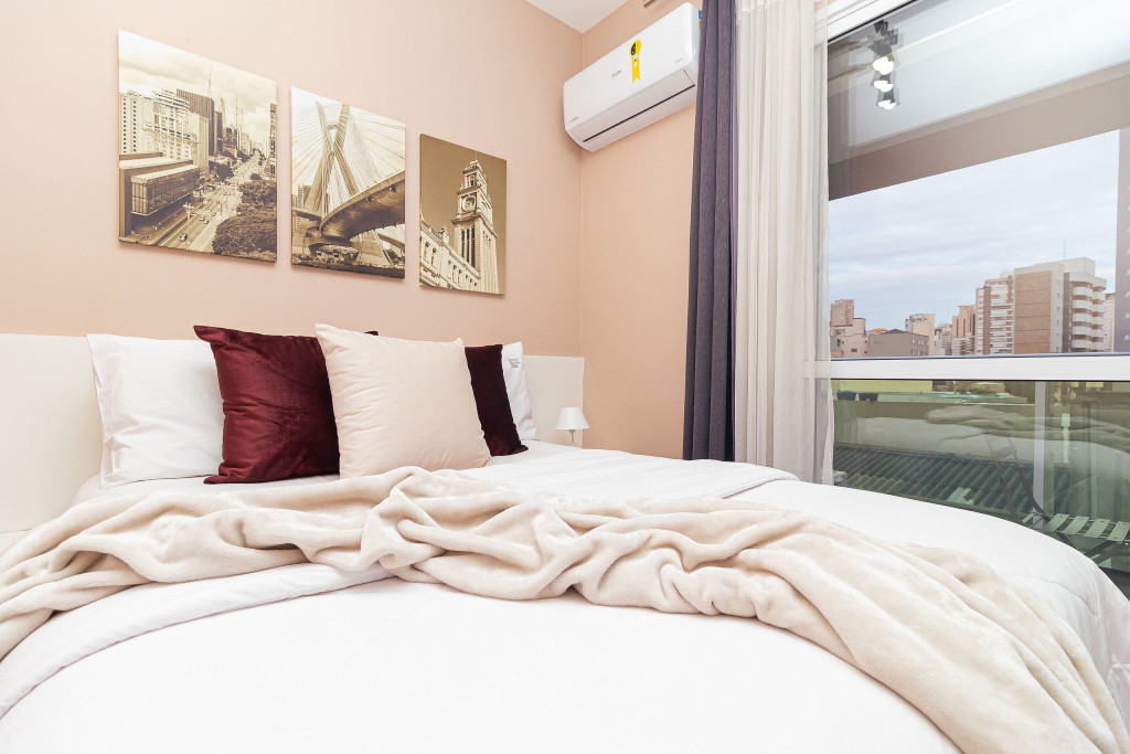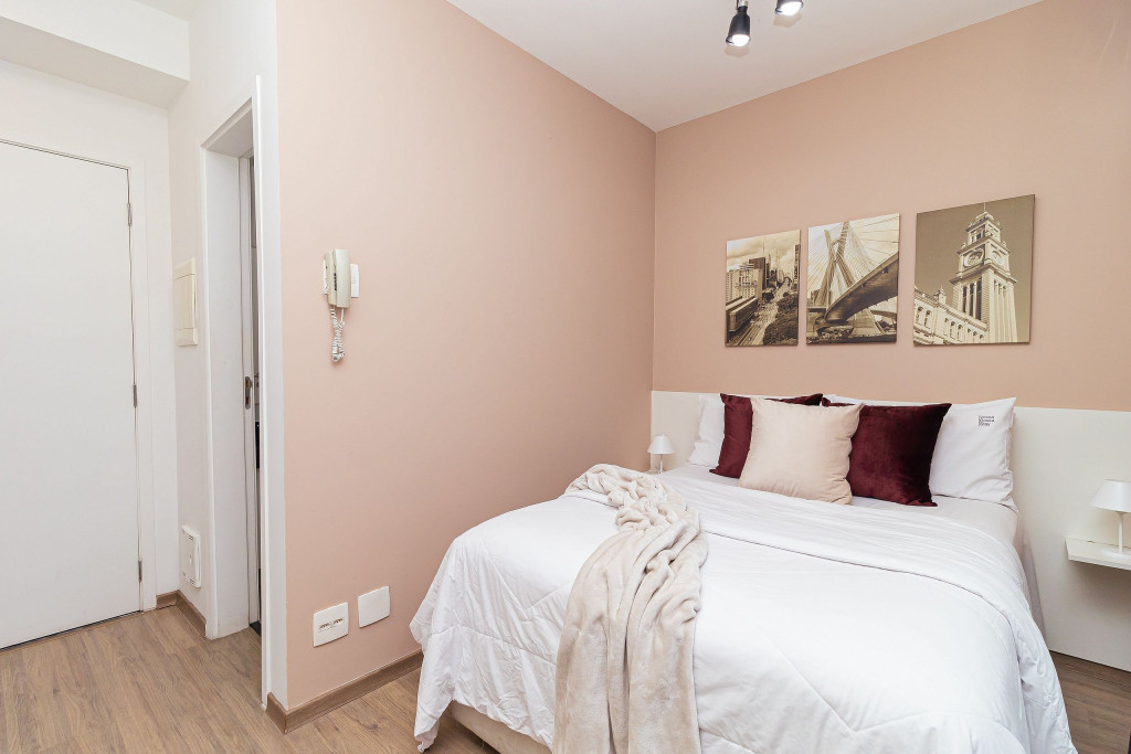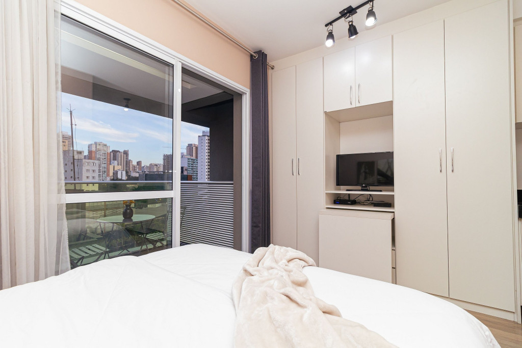 Acomodação completa para sua estadia, o espaço é moderno, bem aproveitado e decorado nas cores cinza e branco para você se hospedar com conforto e elegância na rua Turiassú ao lado do Allianz Parque, com frigobar, fogão por indução, microondas, utensílios de cozinha, ar-condicionado, cama queen-size, wi-fi e televisão.