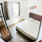 . No 1º quarto possui 1 cama de casal e 1 guarda roupas tipo closet aberto com gavetas e cabides