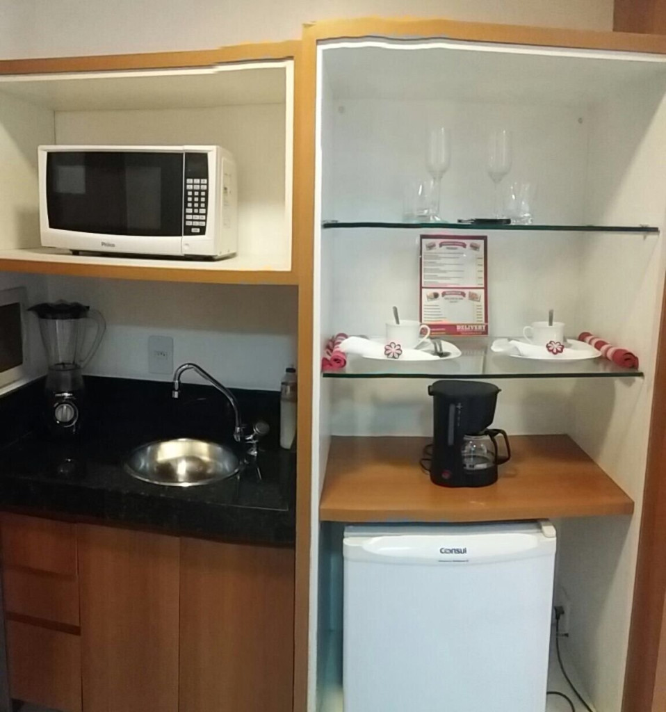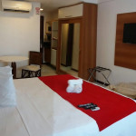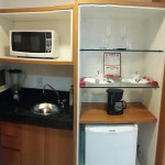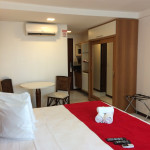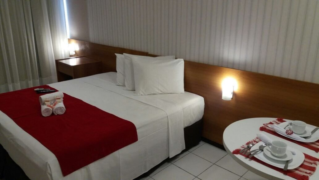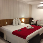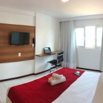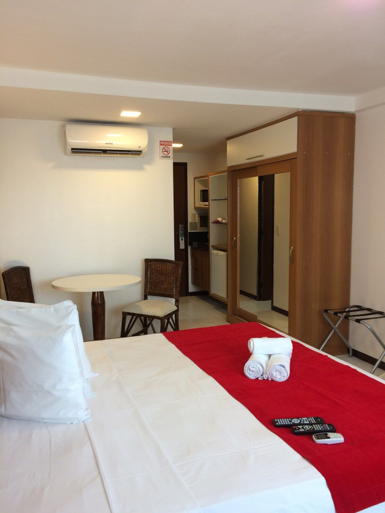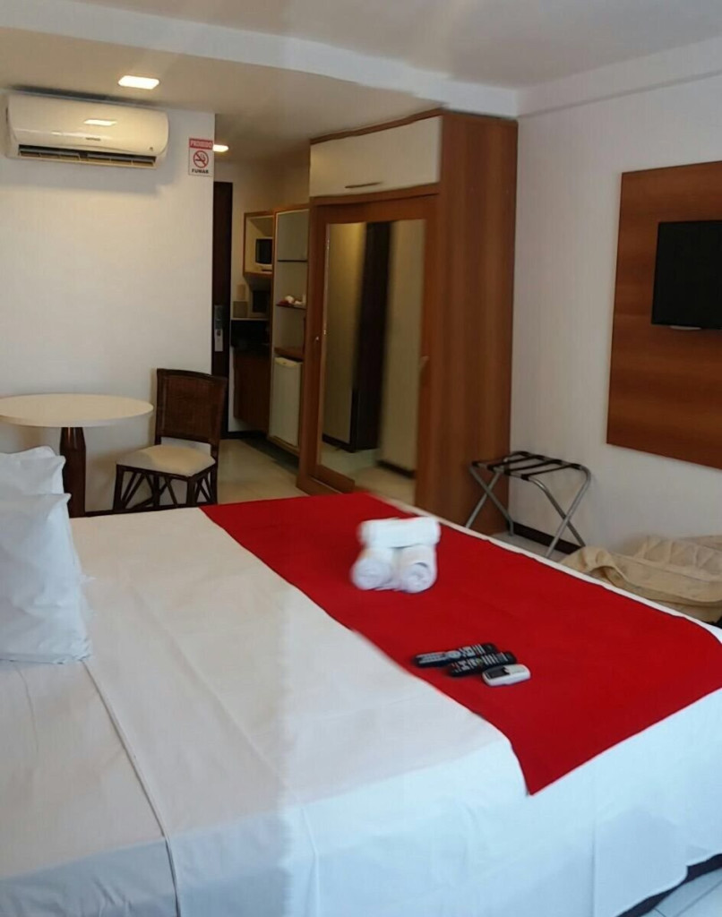 - Equipada com wi-fi, ar condicionado, televisão, micro-ondas, frigobar, cafeteira, liquidificador, torradeira, louças e talheres para refeições e serviços de quarto com trocas de toalhas.
