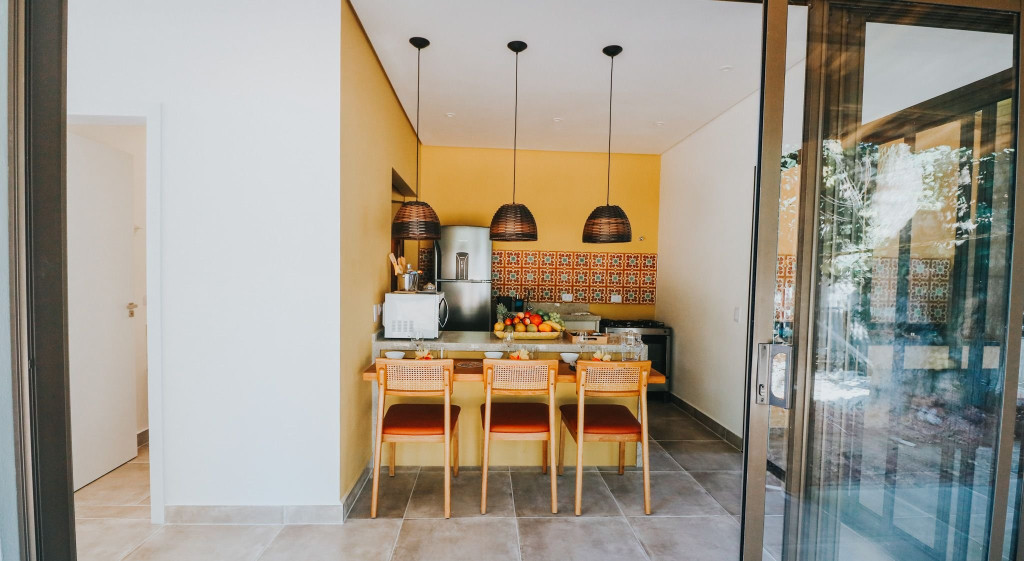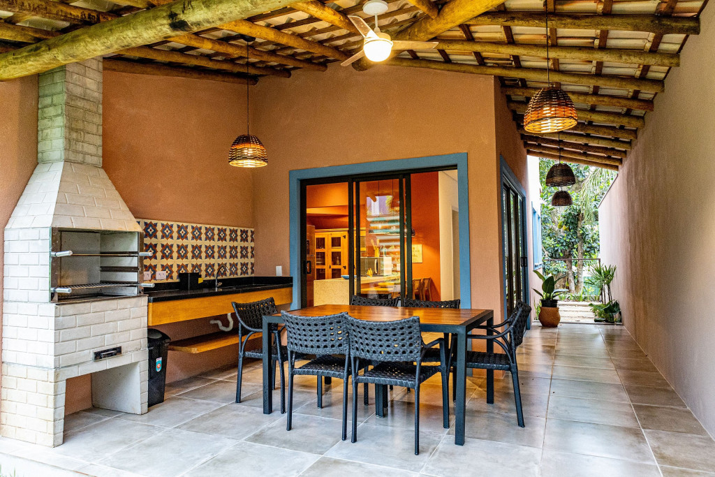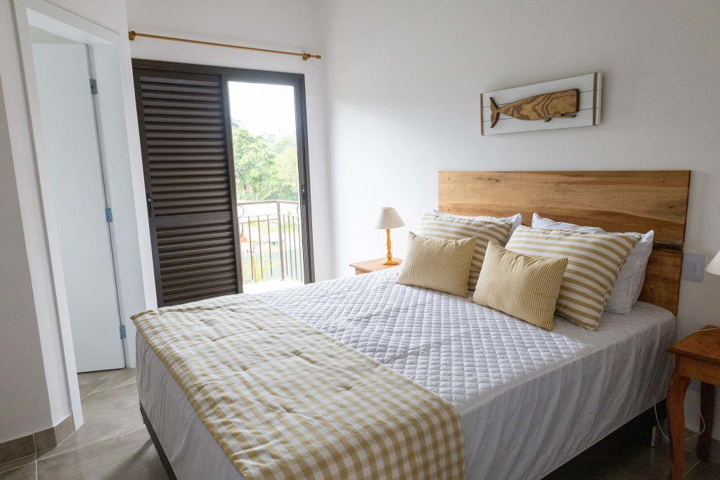Nosso espaço oferece comodidade, modernidade e conforto. Nossos bangalôs foram decorados seguindo os valores e referências da tradição caiçara da Ilhabela.Cada um deles, possui uma área de cerca de 100 m², acomodando 5 pessoas em 2 suítes que ficam no piso superior da casa. Uma das suítes é de casal e a outra é tripla (uma bicama e uma cama de solteiro). Ambas possuem ar condicionado e armário. A suíte de casal possui varanda.A sala de estar é um ambiente confortável, possui sofás, poltronas e uma TV Smart de 50 polegadas. Oferecemos WI-FI de alta velocidade para quem desejar trabalhar home office.Nossa cozinha americana é completa com todos os utensílios necessários para sua estadia.No espaço externo da casa temos a área com churrasqueira, pia, mesa, cadeiras e jardim privativo.O ponto alto da acomodação fica na área comum do condomínio onde temos piscina, churrasqueira, quadra oficial de beach tennis, solarium, gazebos, espreguiçadeiras, academia completa e estacionamento.Nossa casa é pet friendly, seu pet é muito bem-vindo no nosso imóvel. Basta apenas seguir as boas regras de convivência.