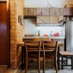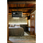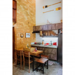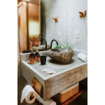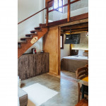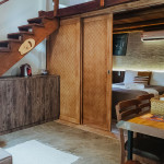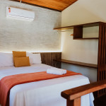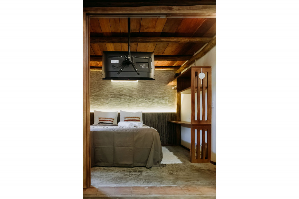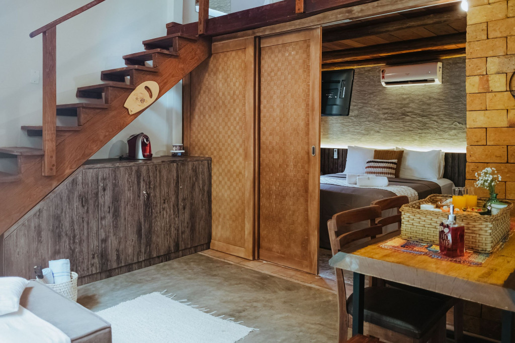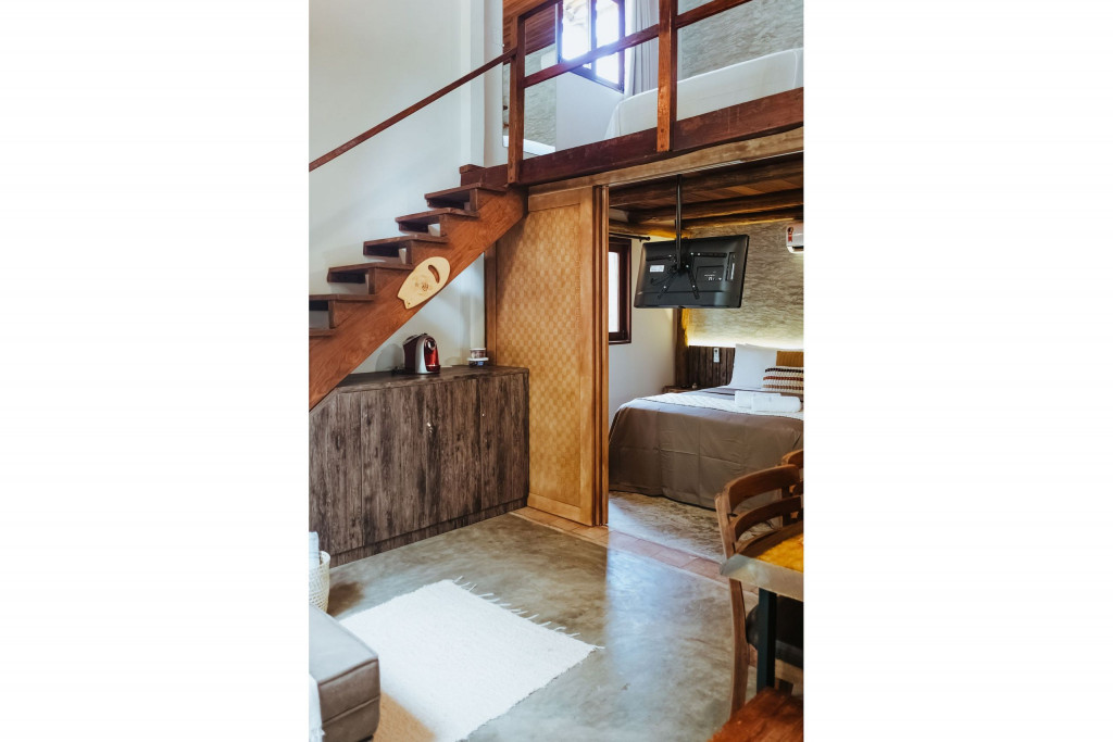O espaço interno do bangalô contempla um pavimento térreo com quarto com cama queen, sala de jantar e estar com um confortável puff futon que pode ser utilizado como cama de solteiro, cozinha e banheiro, além de um pavimento superior que consiste em um charmoso mezanino de madeira, com acesso através de uma escada Santos Dumont, contemplando mais um dormitório, também com cama queen e um segundo banheiro privativo.