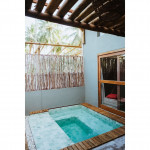 Já o espaço externo do bangalô compreende uma piscina privativa com pontos de hidromassagem, e espaço gourmet com churrasqueira. Além disso, ficam à disposição dos hospedes cadeiras de praia e cooler que podem ser levados à praia, bem como chamosas bicicletas que encontram-se na area comum dos bangalôs.