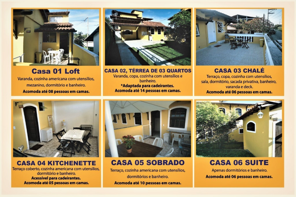 São 06 casas privadas independentes, mobiliadas, com quartos, dormitórios, banheiro, cozinha, terraço e churrasqueiras privativas: