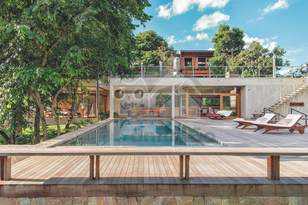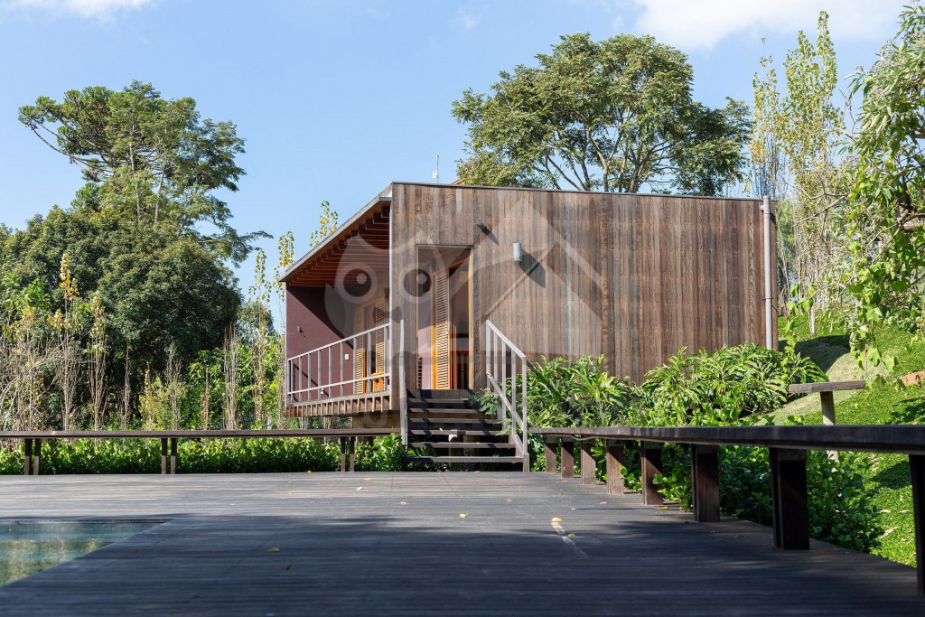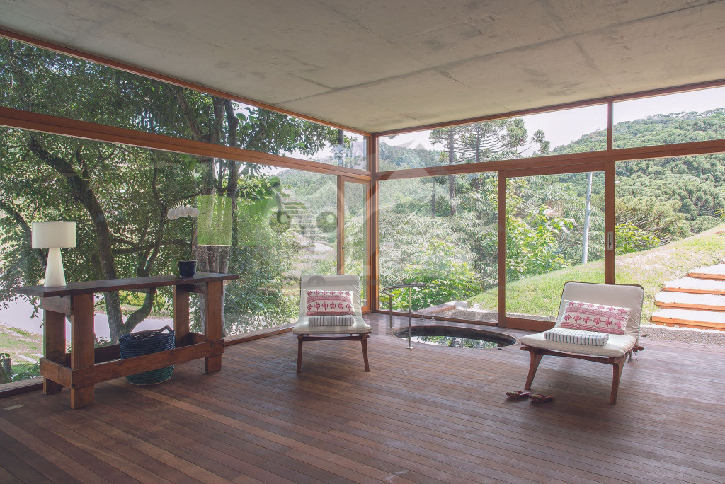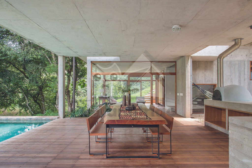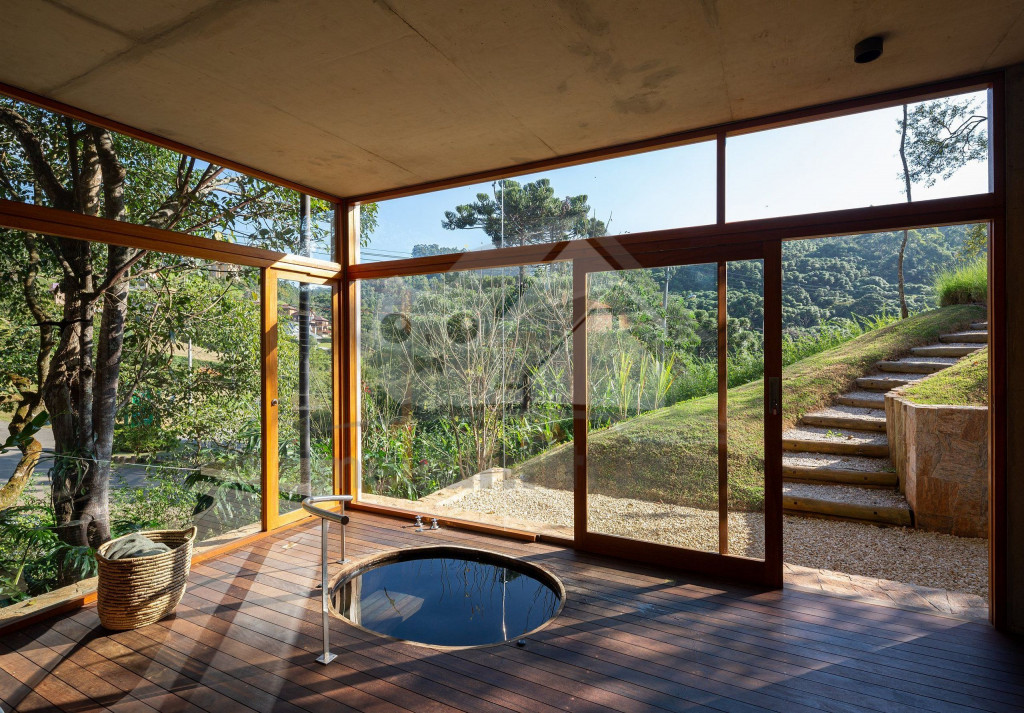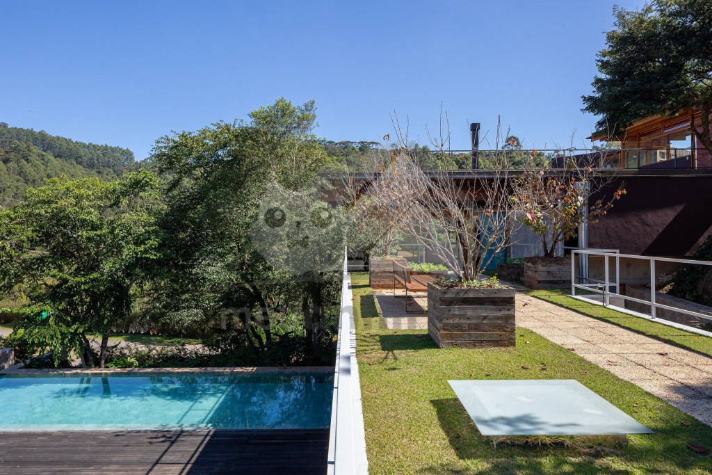 Assinada pelo famoso arquiteto Gui Paoliello, a casa foi dividida em blocos com grandes janelas de vidro que trazem uma sensação de imersão na natureza. Além disso, sua infraestrutura é completa contando com piscina, ofurô, 6 suítes, espaço home office, varandas com vista para montanha, área gourmet e muito mais.