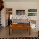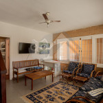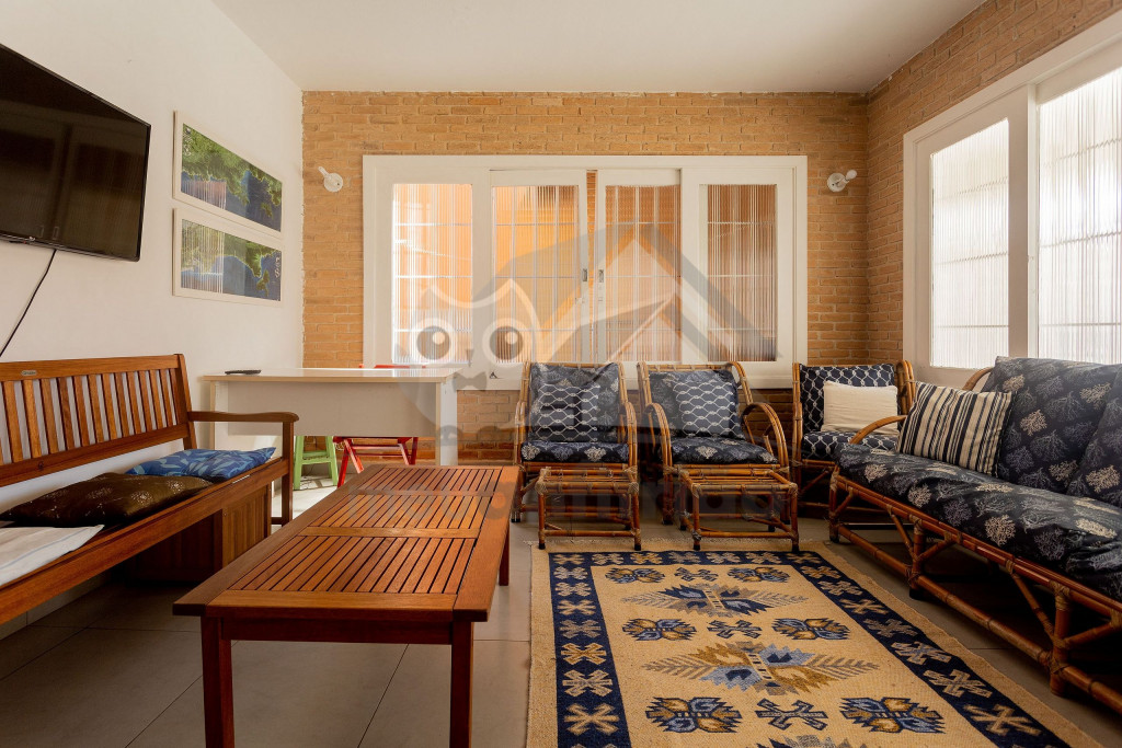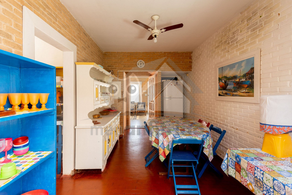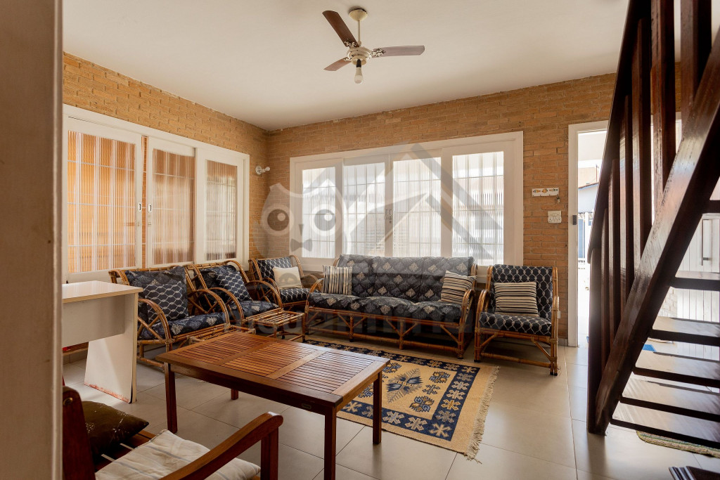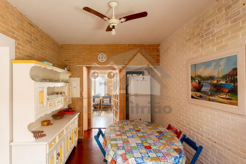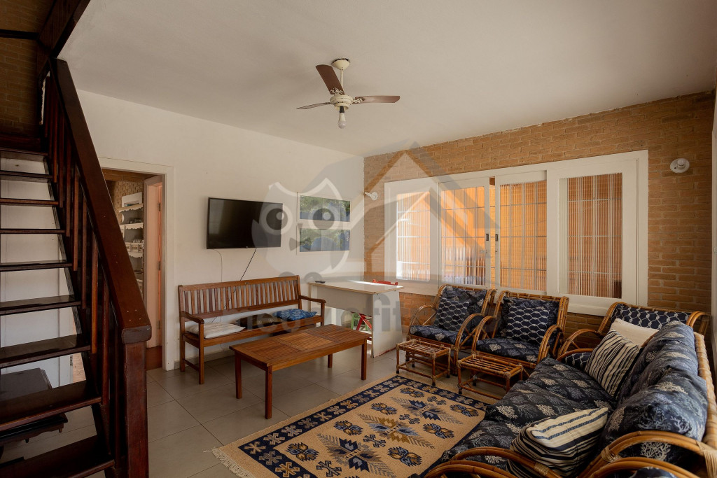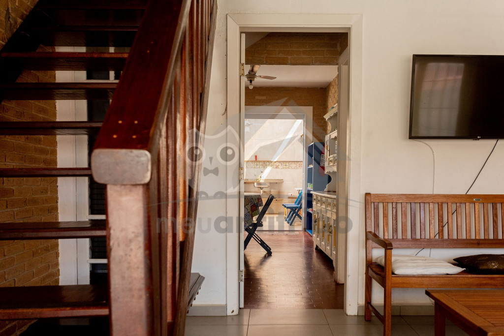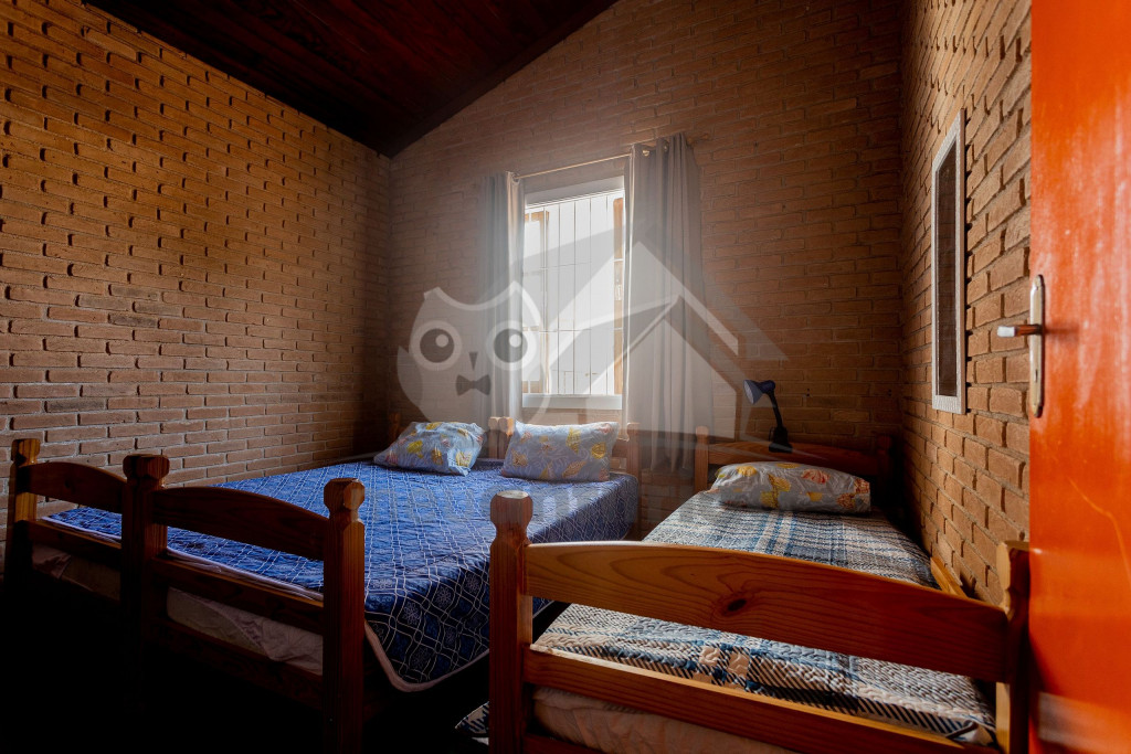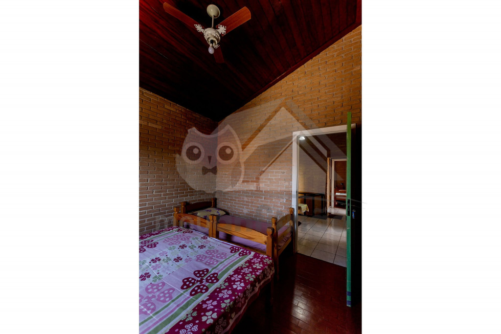 Acomodamos grupos de até 17 pessoas em quatro quartos, sendo camas para 14 pessoas mais 3 colchões avulsos.No andar superior temos um hall, três quartos amplos, todos com ventiladores de teto, com duas camas de casal, quatro camas de solteiro, dois beliches, e dois banheiros completos e espaçosos.No térreo temos uma ampla sala de estar com televisão, sofás e poltronas e a sala de jantar conta com uma mesa para 10 lugares, geladeira, mesa de apoio e um armário com louças e talheres. Além disso, uma cozinha completa com fogão de cinco bocas, micro-ondas, equipamentos elétricos, vários tamanhos de panelas e utensílios.Há também um quarto grande com duas camas de solteiro e um beliche. Um banheiro completo atende a todo pavimento térreo. Uma ampla porta blindex une a sala de jantar à área externa gourmet, que conta com pia, churrasqueira e bancos de madeira, para relaxar da melhor maneira após um bom dia de praia.Dispomos também de duas vagas de garagem privativas e espaço para um terceiro veículo na frente da casa. Na varanda temos suportes para duas redes, levem as suas!