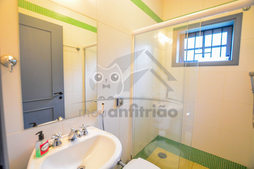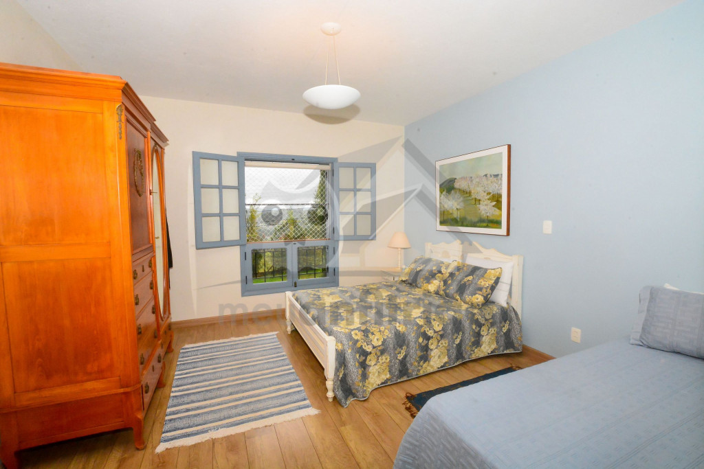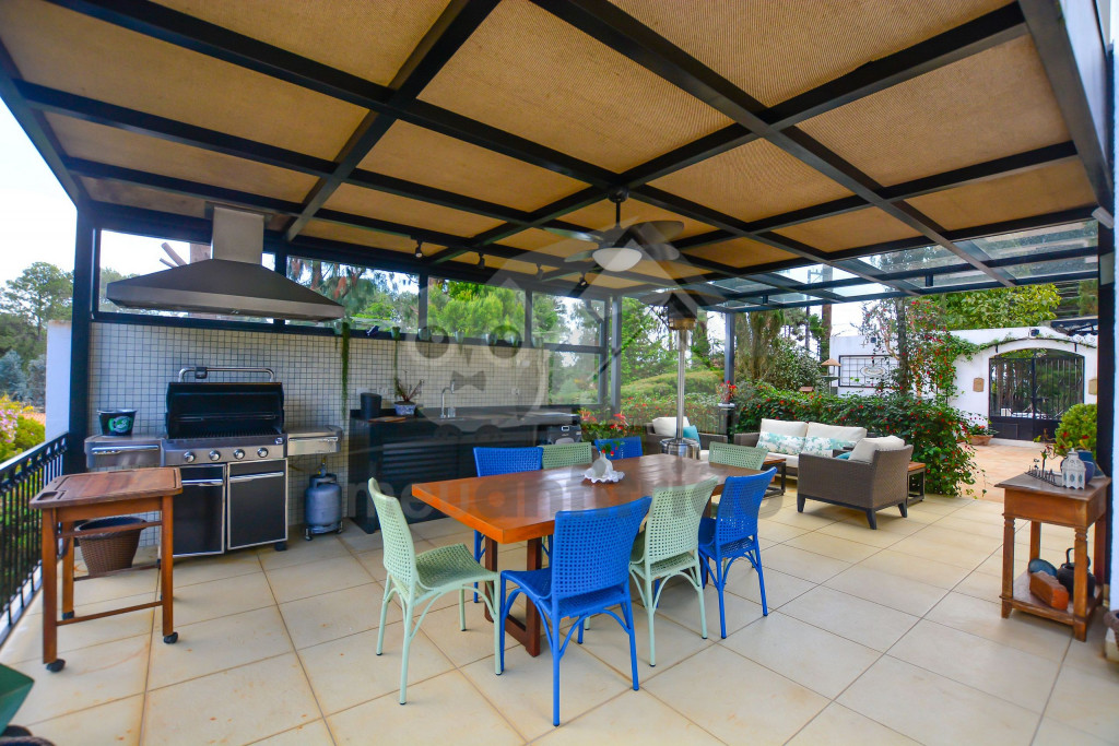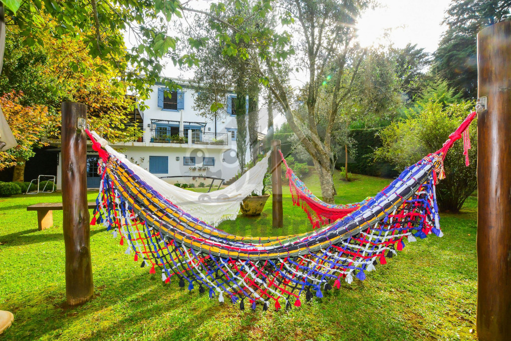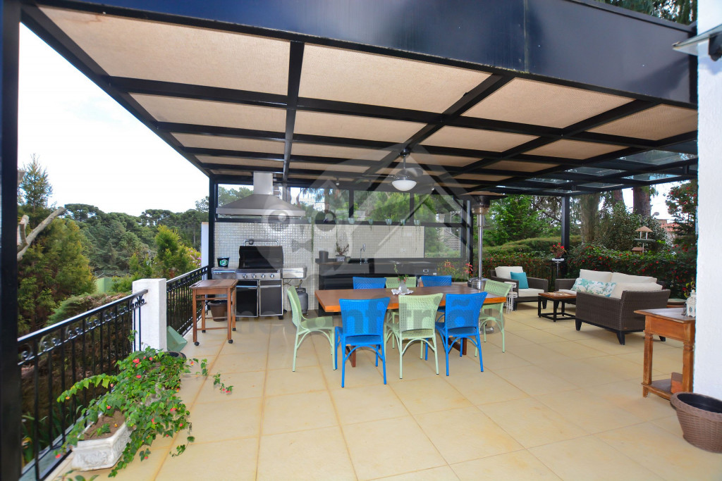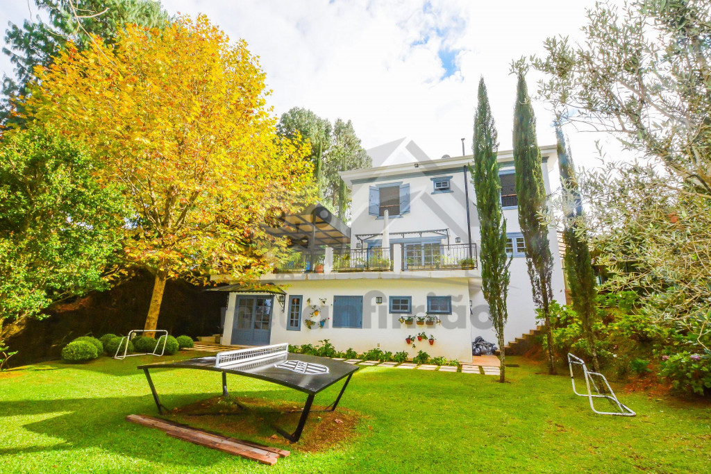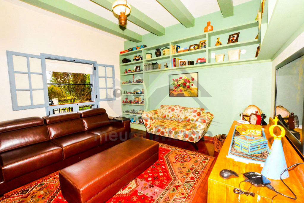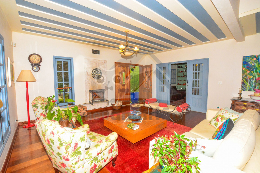 A sala de estar dispõe de sofás, mesa de centro e uma lareira, o que torna o ambiente super aconchegante e perfeito para aproveitar o clima tão característico da montanha. Temos, também, uma sala de televisão ampla, com sofá espaçoso e super bem decorada, além de uma cozinha grande e moderna conjugada à sala de jantar que conta com mesa de 10 lugares.