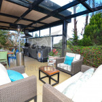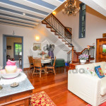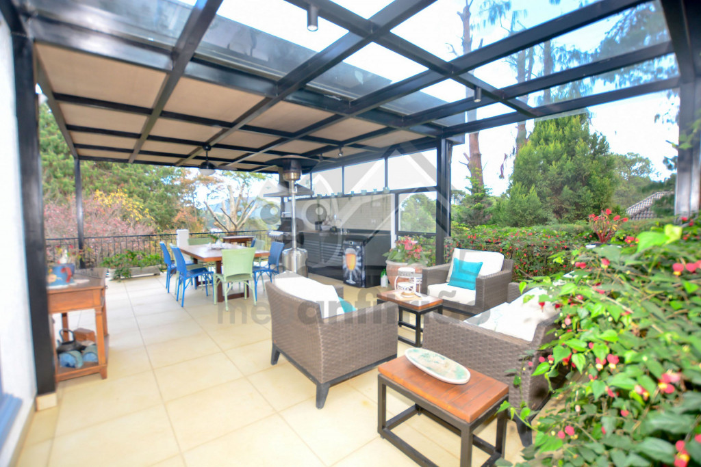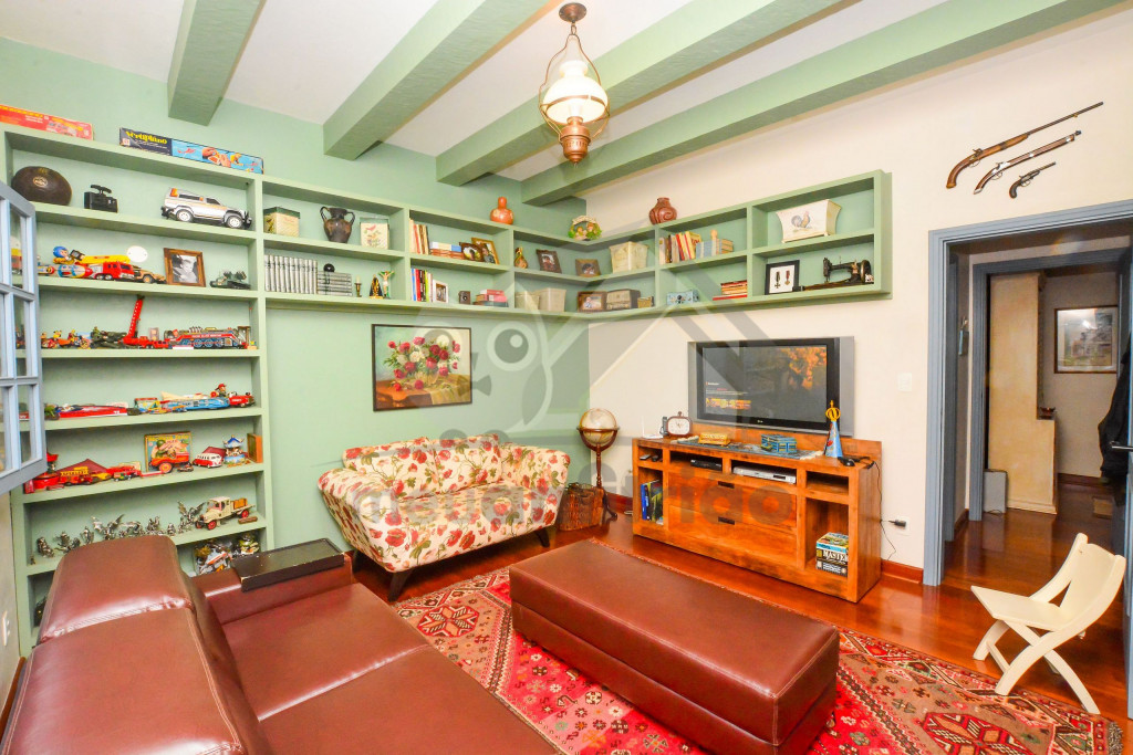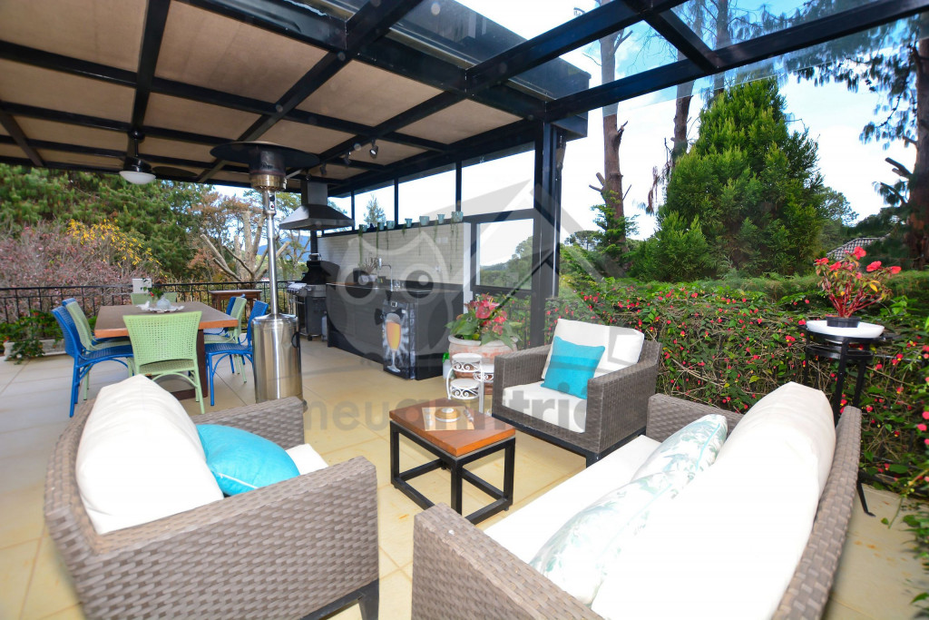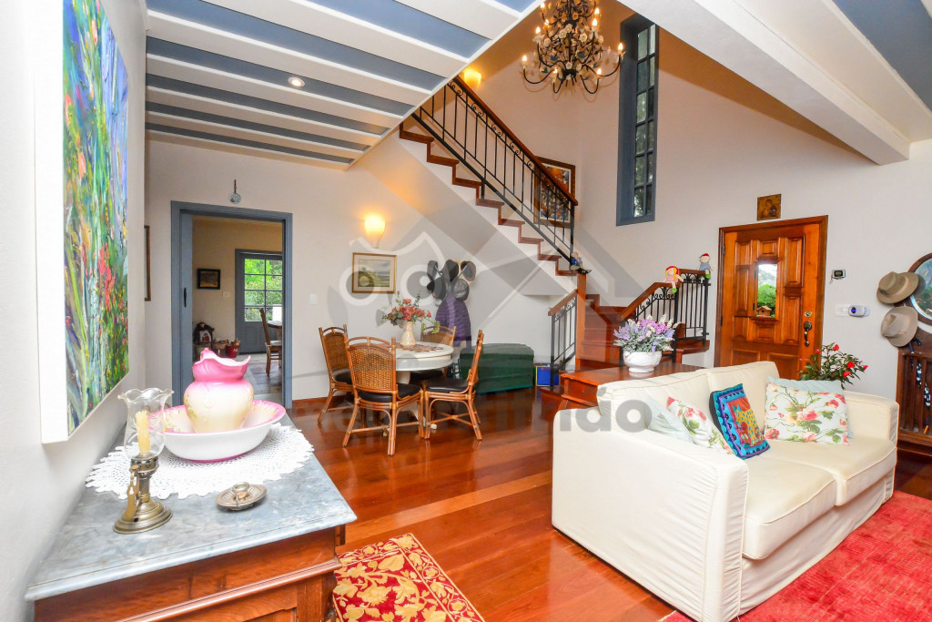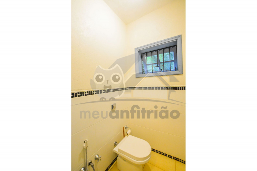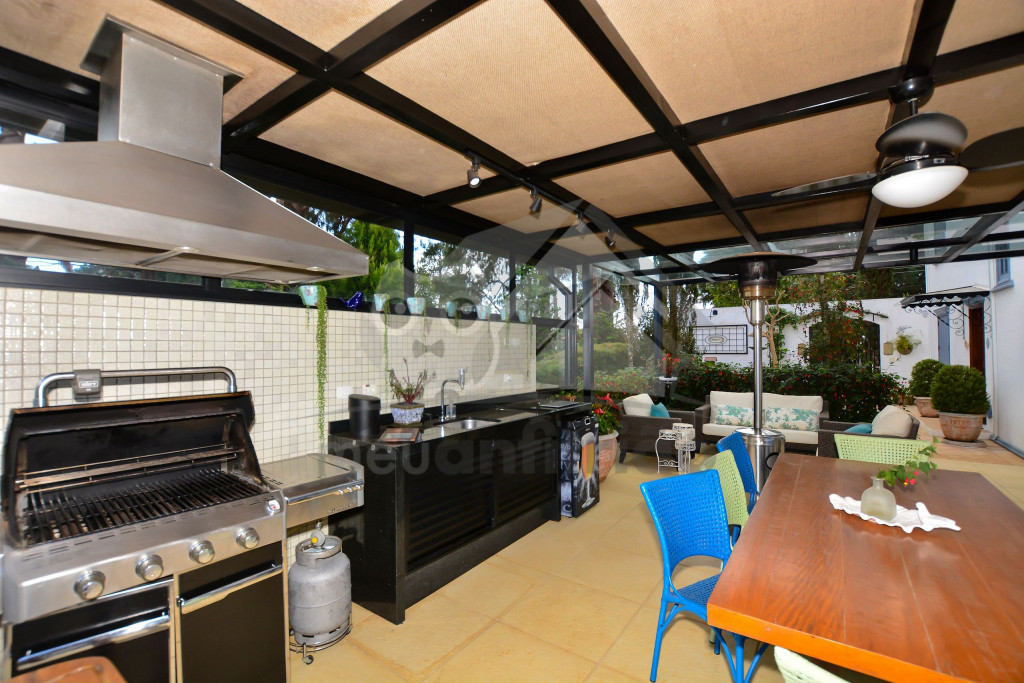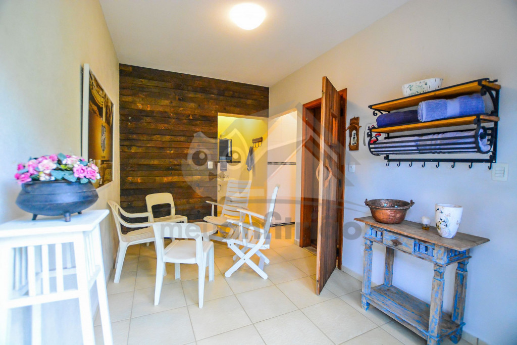 A sala de estar dispõe de sofás, mesa de centro e uma lareira, o que torna o ambiente super aconchegante e perfeito para aproveitar o clima tão característico da montanha. Temos, também, uma sala de televisão ampla, com sofá espaçoso e super bem decorada, além de uma cozinha grande e moderna conjugada à sala de jantar que conta com mesa de 10 lugares.