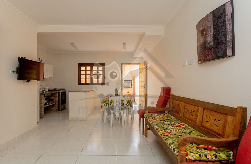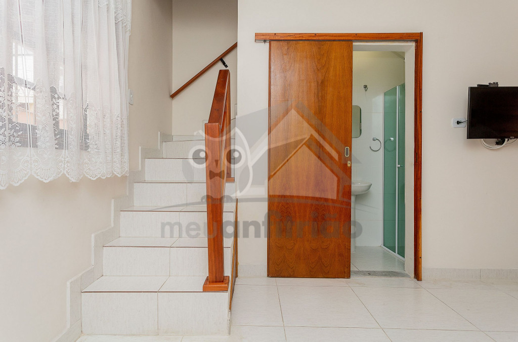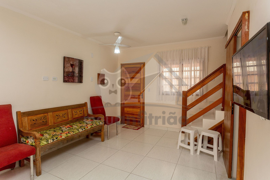 Ao entrar no chalé, logo no piso térreo, nossos hóspedes encontrarão uma sala de estar com bancos televisão de 32 polegadas e ventilador de teto. Integrada a ela, dispomos de uma sala de jantar e uma cozinha completa contendo todos os utensílios necessários para a estadia. Há também um banheiro no térreo.