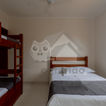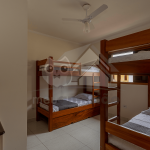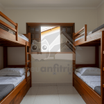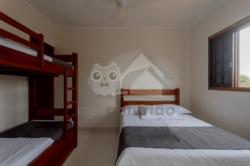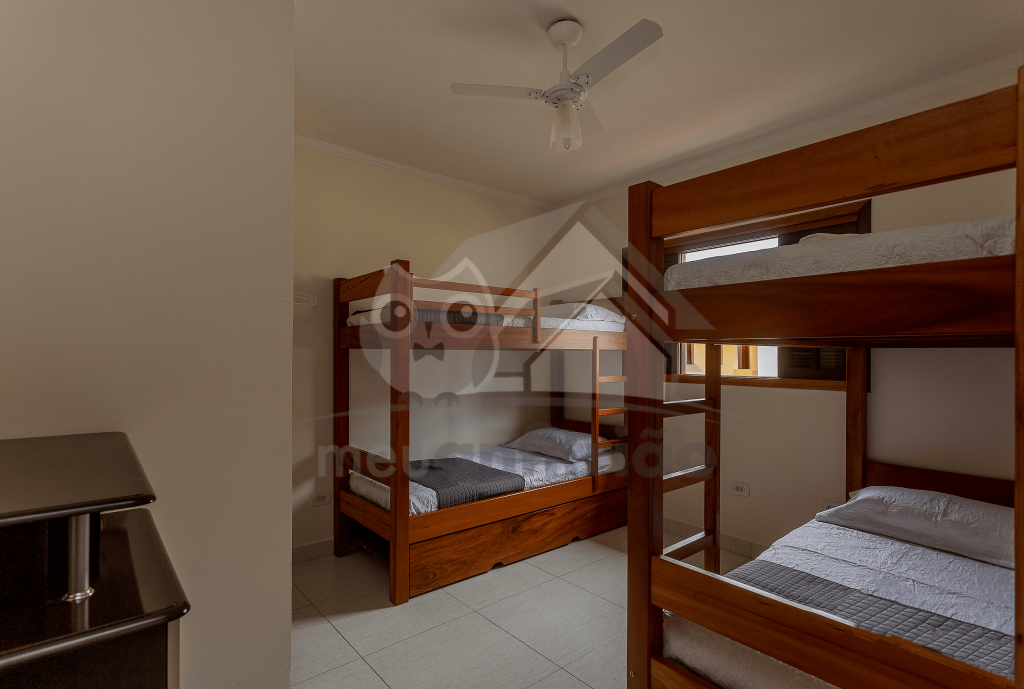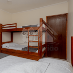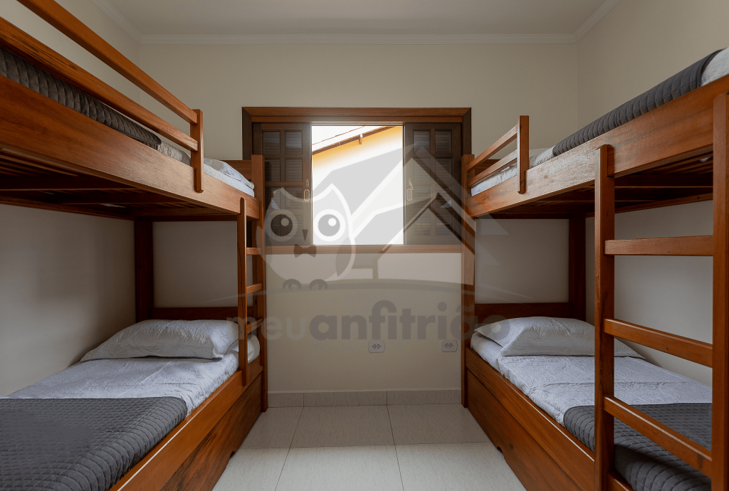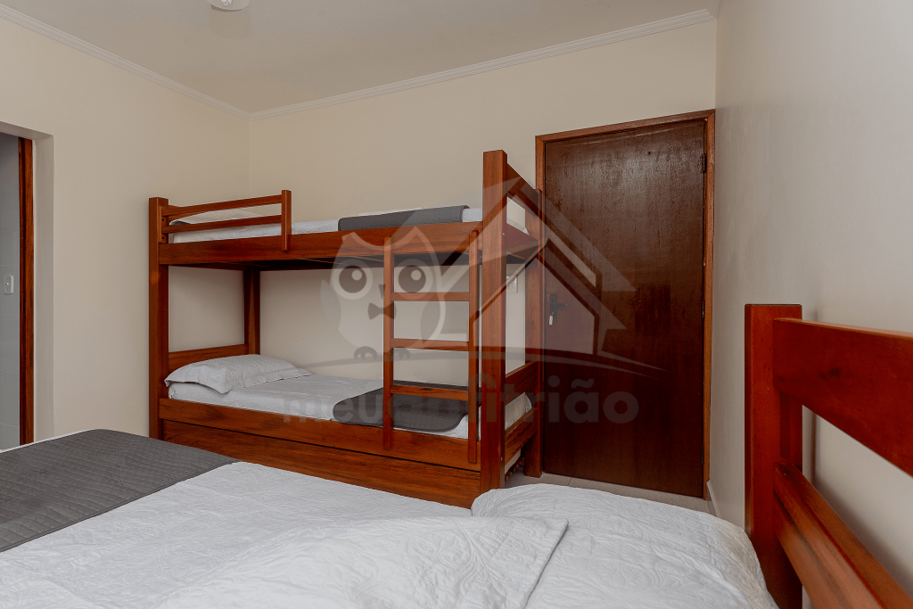 No primeiro andar do chalé, subindo as escadas, encontram-se duas suítes, sendo: uma com duas beliches e outra com uma cama de casal e um beliche. Ambas possuem ventilador de teto.