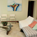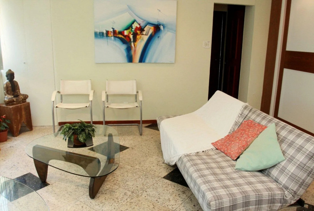A sala tem um sofá cama que acomoda 2 pessoas pequenas e ar split, além de mesa de jantar para 4 pessoas.