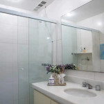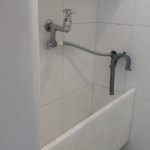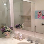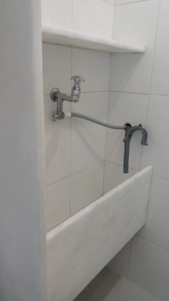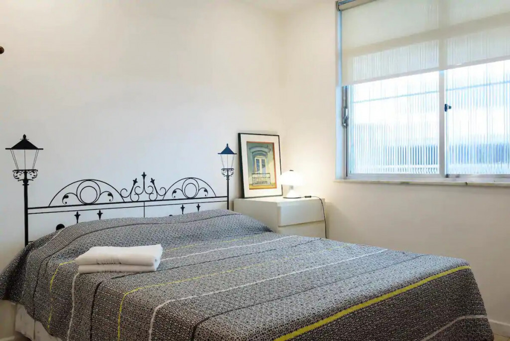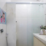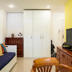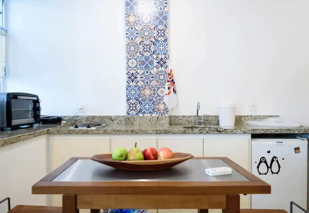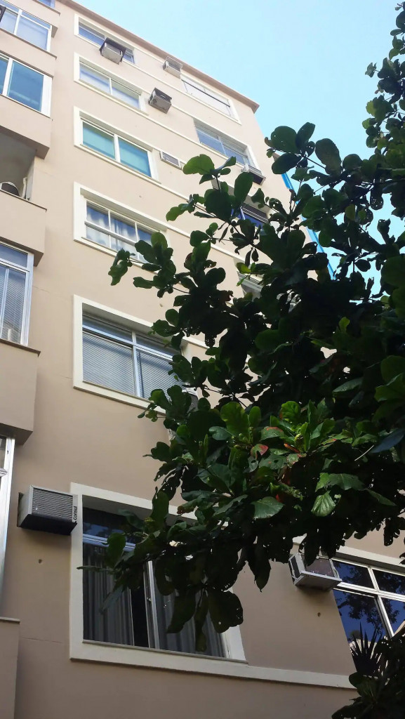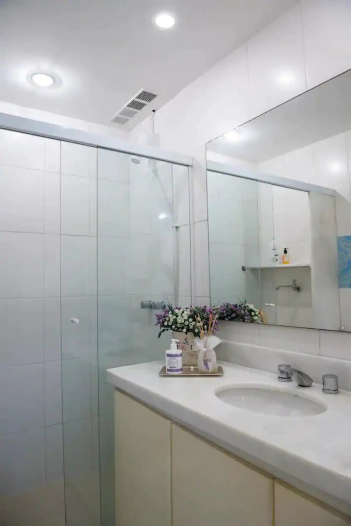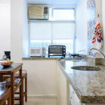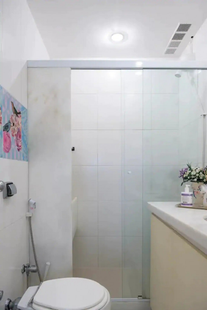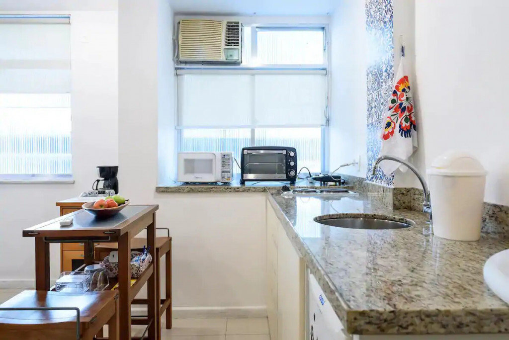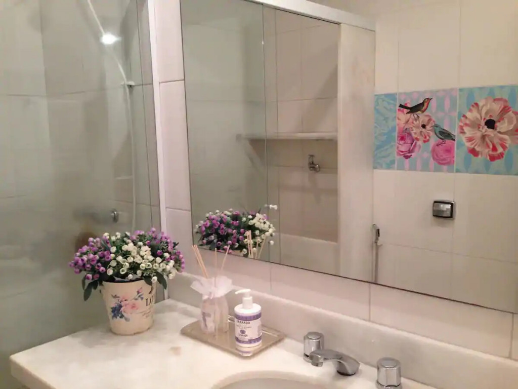 The bathroom has a shower and a small laundry sink. The building has 24 hour concierge and is a couple blocks away from Ipanema Subway station.