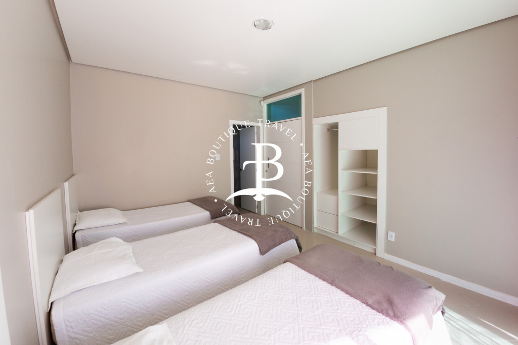 Distribuição dos quartos todos (suítes), com ar condicionado. Piso superior: quarto 1: 1 Cama(s) ‘king’ size, banheiro com banheira e varanda. Quarto 2: 1 (cama) ‘king’ size e varanda. Quarto 3: 1 cama de casal, 1 cama de solteiro e varanda. Quarto 4: 1 cama de casal, 1 cama de solteiro e varanda. Quarto 5: 1 cama de casal. Piso térreo. Quarto 6: 3 camas de solteiro.
